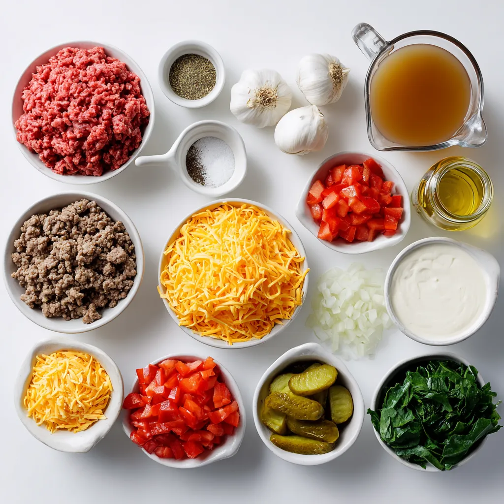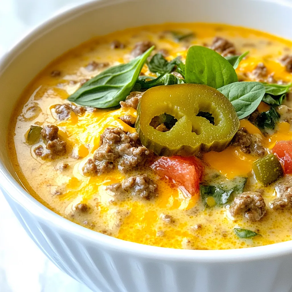 To make a tasty Keto Cheeseburger Soup, you'll need the following: - 1 lb ground beef - 1 medium onion, diced - 2 cloves garlic, minced - 4 cups beef broth - 1 cup heavy cream - 1 cup shredded cheddar cheese - 1/2 cup diced tomatoes (canned or fresh) - 1/4 cup pickles, diced - 2 teaspoons Italian seasoning - Salt and pepper to taste - 2 tablespoons olive oil - 4 cups fresh spinach or kale (optional) Start by preparing your ingredients. Dice the onion and mince the garlic. This helps release their flavors. Next, prepare the beef. Choose good quality ground beef. The fat content adds rich flavor to your soup. If you want leaner meat, go for 80/20 ground beef. If you use canned tomatoes, drain them before adding. Fresh tomatoes work well too. Just chop them into small pieces. For the pickles, dice them into tiny bits. This will add a nice crunch to the soup. Finally, wash and chop the spinach or kale if you choose to use it. When picking ground beef, look for bright red color. Avoid brown spots, as they indicate age. For onions, choose firm ones without soft spots. Garlic should be dry and plump. For beef broth, go for low-sodium options. This way, you can control the salt in your soup. Heavy cream should be fresh and cold. Check the date on the label. Choose sharp cheddar cheese for a stronger flavor. This adds richness to your soup. Use fresh vegetables whenever possible. They taste better and add nutrients. If you can, buy organic produce. This is better for your health and the environment. {{ingredient_image_1}} Start by heating olive oil in a large pot over medium heat. Add diced onion and minced garlic. Sauté them until the onion turns translucent, about 3-4 minutes. Next, add the ground beef. Cook it until it’s browned. Break the meat apart with a spoon as it cooks. Season the beef with salt, pepper, and Italian seasoning. This adds great flavor. Now, pour in the beef broth. Bring the mixture to a simmer. Let it cook for about 10 minutes. This helps all the flavors blend together. After that, stir in the diced tomatoes, heavy cream, and pickles. Bring the soup back to a gentle simmer. This step makes the soup rich and tasty. To achieve that creamy texture, gradually add the shredded cheddar cheese. Stir continuously until the cheese melts completely. This keeps the soup smooth and velvety. If you want, stir in fresh spinach or kale until it wilts. This adds color and nutrients. Finally, taste and adjust the seasoning with more salt and pepper if needed. Enjoy your hearty bowl of soup! To make a great Keto Cheeseburger Soup, follow these simple tips: - Use fresh ingredients. Fresh produce enhances flavor. - Brown the beef well. This adds depth to the soup. - Don’t rush the simmering. Letting it simmer helps the flavors blend. - Gradually add cheese. This keeps the texture smooth and creamy. - Taste as you go. Adjust salt and pepper to fit your preference. Many home cooks make a few common mistakes: - Overcooking the garlic. It can turn bitter if cooked too long. - Skipping the seasoning. Not seasoning the beef can lead to bland soup. - Adding cheese too fast. If you dump it in all at once, it clumps. - Using low-quality broth. A rich broth makes a big difference in taste. You can easily change the flavor of your soup: - Add herbs. Fresh herbs like parsley or chives can brighten the dish. - Incorporate spices. A pinch of cayenne pepper adds heat. - Experiment with toppings. Try crispy bacon or jalapeños for extra flavor. - Use different cheeses. Swap cheddar for gouda or pepper jack for a twist. Pro Tips Use Quality Beef: Opt for grass-fed ground beef for a richer flavor and healthier fat profile. Customize Your Cheese: Experiment with different cheese varieties like Gouda or Monterey Jack for a unique twist. Make It Spicy: Add a pinch of cayenne pepper or diced jalapeños for an extra kick in your soup. Store Leftovers Safely: Refrigerate any leftover soup in an airtight container for up to 4 days, or freeze for longer storage. {{image_2}} You can switch ingredients to fit your taste. Try ground turkey instead of beef. It gives a lighter flavor. You can also use cauliflower rice instead of heavy cream. This swap keeps it low-carb and adds texture. If you want a dairy-free option, use coconut milk instead of heavy cream. It adds a nice creaminess and sweetness. Toppings make this soup fun! You can add crispy bacon bits for crunch. Chopped green onions add a fresh taste. For spice, sprinkle some red pepper flakes or hot sauce. If you love pickles, add more diced pickles on top. You can also use avocado slices for creaminess. The options are endless! To make this soup vegetarian, use plant-based ground meat. Replace beef broth with vegetable broth. For dairy-free, swap heavy cream with almond or coconut milk. You can add beans for protein and texture. This keeps the soup hearty while fitting your diet. Enjoy the same great taste in every bowl! To keep your Keto Cheeseburger Soup fresh, let it cool first. Use airtight containers for storage. Place the soup in the fridge if you plan to eat it within three days. If you need more time, freeze it instead. When you’re ready to enjoy your soup again, take it out of the fridge or freezer. If frozen, let it thaw in the fridge overnight. Heat the soup in a pot over low heat. Stir often to prevent sticking. You may need to add a bit of beef broth or cream to restore its creamy texture. For long-term storage, freeze the soup in individual portions. This makes it easy to grab just what you need. Use freezer-safe bags or containers. Remove as much air as possible to avoid freezer burn. The soup can last up to three months in the freezer. Yes, Keto Cheeseburger Soup is healthy. It uses lean ground beef, which is rich in protein. The heavy cream adds healthy fats, making it great for a keto diet. Spinach or kale boosts vitamins and minerals. Plus, it has low carbs, keeping your diet on track. This soup fits perfectly into a balanced meal plan. A