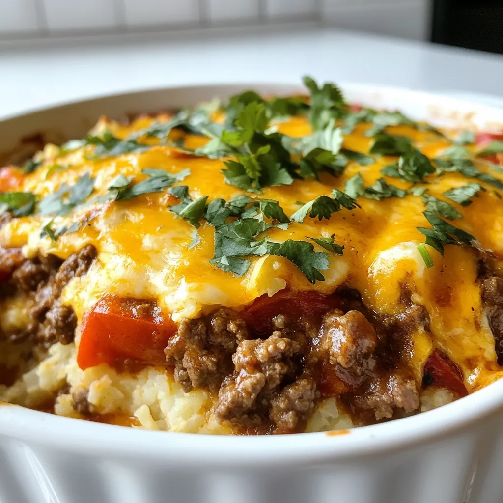 A delicious low-carb casserole featuring ground beef, riced cauliflower, and cheese, seasoned with Mexican spices.