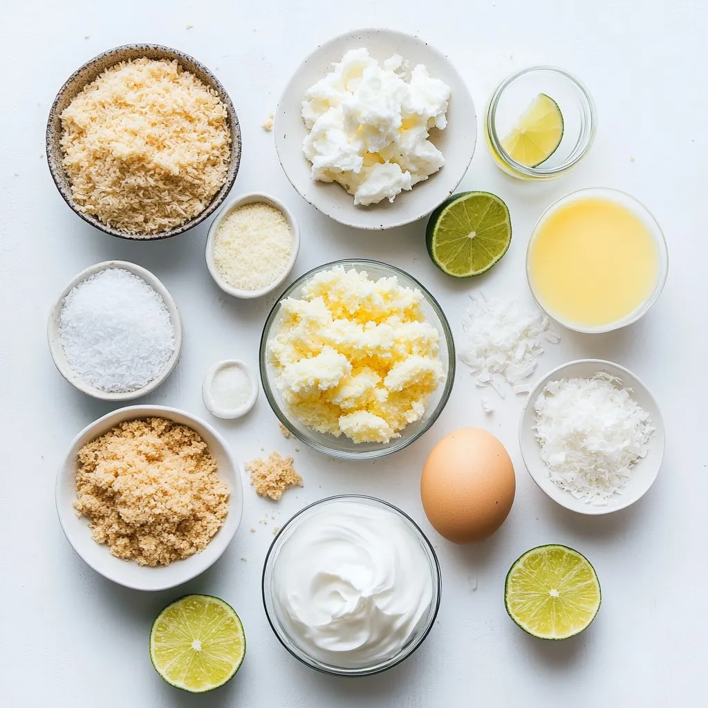 For these key lime pie bars, you need simple and fresh ingredients. I love using graham cracker crumbs for the crust. The coconut adds a nice touch. You mix these with sugar and melted butter to create a base that is both crispy and sweet.