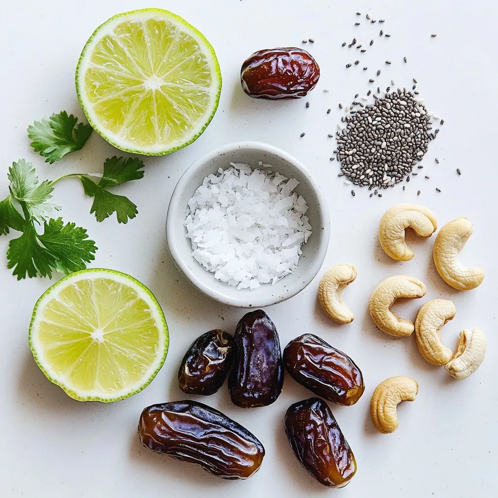 Start by gathering your ingredients. You will need one cup of pitted Medjool dates, one cup of raw cashews, and half a cup of unsweetened shredded coconut. You will also need a quarter cup of fresh lime juice, lime zest, one teaspoon of vanilla extract, half a teaspoon of sea salt, and two tablespoons of chia seeds.