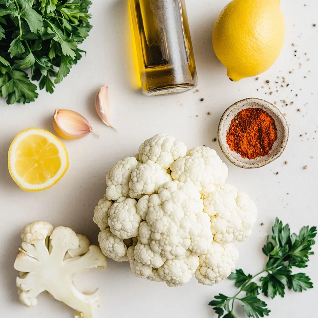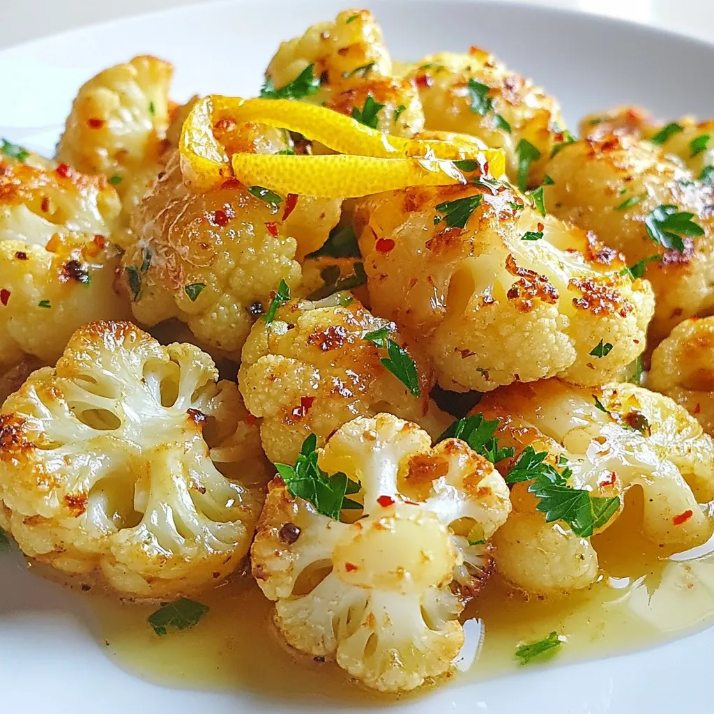 - 1 medium head of cauliflower, cut into florets - 3 tablespoons olive oil - 4 cloves of garlic, minced - Zest of 1 lemon - Juice of 1 lemon Cauliflower is the star of this dish. It has a great texture and flavor. Olive oil helps the cauliflower roast well and adds richness. Garlic gives it a punch of flavor. The lemon zest and juice add brightness and freshness. - 1 teaspoon smoked paprika - 1 teaspoon cumin - Salt and pepper to taste Smoked paprika brings a warm, smoky taste. Cumin adds a hint of earthiness. Salt and pepper are key to enhancing the flavors. - Fresh parsley, chopped (for garnish) - Crushed red pepper flakes (optional, for heat) Fresh parsley adds a nice pop of color. It also brings a fresh taste. If you like heat, crushed red pepper flakes are a great choice. They give the dish a nice kick! {{ingredient_image_1}} Preheat your oven to 425°F (220°C). This high heat will help the cauliflower roast well. Next, prepare the lemon-garlic mixture. In a large bowl, mix together 3 tablespoons of olive oil, 4 minced garlic cloves, the zest of 1 lemon, and the juice of that lemon. Add 1 teaspoon of smoked paprika, 1 teaspoon of cumin, salt, and pepper to taste. This mix will give the cauliflower a tasty punch. Now, coat the cauliflower. Take 1 medium head of cauliflower and cut it into florets. Add these florets to your lemon-garlic bowl. Toss them well so they get a nice coat of flavor. Then, arrange the coated cauliflower on a baking sheet lined with parchment paper. Make sure they are in a single layer. This helps them roast evenly. Roast the cauliflower for about 25-30 minutes. Stir them halfway through for even cooking. You want them to be tender and golden brown. For a nice caramelized finish, broil the cauliflower for an extra 2-3 minutes. Keep an eye on them to avoid burning. Once done, remove them from the oven. You can sprinkle fresh parsley on top and add crushed red pepper flakes for a bit of heat, if you like. To achieve the perfect roast, start with a hot oven. Preheat it to 425°F (220°C). This high heat helps caramelize the cauliflower. Cut the florets into even sizes. This way, they will cook evenly. Toss the cauliflower well in the lemon-garlic mix. Make sure each piece is coated. This ensures full flavor in every bite. Stir halfway through roasting to avoid uneven cooking. If you like spice, adjust the heat to your taste. Add crushed red pepper flakes for a kick. Start with a small pinch and taste as you go. This allows you to control the spice level. For serving, place the roasted cauliflower on a large platter. Drizzle with extra lemon juice for brightness. This adds a fresh zing to the dish. Garnish with chopped fresh parsley. It adds color and a fresh taste. You can also sprinkle on more red pepper flakes. This gives a nice visual appeal and enhances the flavor. Cauliflower is a superfood! It is low in calories but high in fiber. This helps with digestion and keeps you full. It is also rich in vitamins C and K. These vitamins support your immune system and bone health. For portion sizing, aim for about 1 cup per serving. This amount provides great nutrition without overdoing it. If you serve it as a main dish, consider adding a protein for balance. Pro Tips Choose Fresh Cauliflower: Look for a cauliflower head that is firm and compact, with no dark spots or blemishes for the best flavor and texture. Adjust the Seasoning: Feel free to experiment with different spices or herbs, such as Italian seasoning or curry powder, to create your own unique flavor profile. Don’t Overcrowd the Pan: Make sure to spread the cauliflower out in a single layer on the baking sheet to ensure even roasting and browning. Perfectly Balanced Flavor: Adding a pinch of sugar can help balance the acidity of the lemon, enhancing the overall taste of the dish. {{image_2}} You can change up the flavor of your lemon garlic roasted cauliflower. Adding herbs can make it more vibrant. Try thyme or rosemary for a fresh twist. You can also use different spices. Curry powder gives a warm taste. Each spice or herb adds its own magic. Feel free to swap out the cauliflower. Broccoli or Brussels sprouts work great too. You can even mix in carrots for a splash of color. For vegan options, use coconut oil instead of olive oil. This keeps the dish plant-based while adding a sweet flavor. This dish pairs well with many proteins. Grilled chicken or fish complements the flavors nicely. You can also serve it as a salad topping. It adds crunch and zest to any leafy mix. Don’t be afraid to get creative with how you enjoy it! After enjoying your Lemon Garlic Roasted Cauliflower, store leftovers in the fridge. Place them in an airtight container to keep them fresh. This helps prevent moisture loss and keeps flavors intact. You can store them for up to 4 days. If you want to keep them longer, consider freezing them. To freeze, let the roasted cauliflower cool completely. Then, spread the florets on a baking sheet in a single layer. This prevents them from sticking together. Freeze for about 1-2 hours until solid. Once frozen, transfer the florets to a freezer-safe bag. Remove as much air as possible. They can last up to 3 months in the freezer. When reheating, aim for the best flavor and texture. The oven works well for this. Preheat your oven to 350°F (175°C). Spread the cauliflower on a baking sheet and cover with foil. Heat for about 15-20 minutes. For a crispy finish, remove the foil for the last 5 minutes. You can also reheat in a skillet over medium heat, stirring occasionally, for about 5-7 minutes. This method keeps the cauliflower delicious and warm. Roast cauliflower at 425 degrees Fahrenheit for about 25-30 minutes. You want it to be tender and golden brown. Stir it halfway through cooking for even browning. If you like it more caramelized, you can broil it for 2-3 minutes at the end. Just watch it closely to avoid burning! Yes, this recipe can easily be made vegan. The ingredients are mostly 