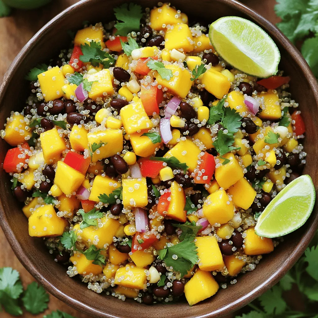 - 1 cup quinoa, rinsed - 2 cups vegetable broth - 1 ripe mango, diced - 1 can (15 oz) black beans, rinsed and drained - 1 red bell pepper, diced - 1 cup corn (fresh, frozen, or canned) - 1/4 cup red onion, finely chopped - 1/4 cup cilantro, chopped - 1/4 cup lime juice - 3 tablespoons olive oil The main ingredients in this salad create a blend of flavors and textures. Quinoa forms a healthy base, while mango adds sweetness. Black beans bring protein, and the red bell pepper adds crunch. Corn gives a nice pop, and red onion adds a sharp bite. Fresh cilantro brightens the dish. Lime juice and olive oil create a zesty dressing. - Additional Vegetables - Protein Additions You can customize this salad with optional ingredients. Adding more veggies like cucumber or avocado enhances texture. For protein, consider grilled chicken or tofu for a heartier meal. Each option adds its own unique flavor. - Cumin and Chili Powder - Salt and Pepper The spices in this salad are key. Cumin offers a warm, earthy taste. Chili powder adds a hint of heat. Salt and pepper balance the flavors. Use them to season to your taste. This simple seasoning elevates the dish without overpowering it. Boiling the Vegetable Broth Start by pouring 2 cups of vegetable broth into a medium saucepan. Place the saucepan on the stove and turn the heat to high. Wait for the broth to boil. This step adds flavor to the quinoa. Rinsing the Quinoa While the broth heats up, rinse 1 cup of quinoa under cold water. Use a fine mesh strainer for best results. This helps remove any bitter coating called saponin. Once rinsed, it’s ready for the broth. Combining Ingredients in a Bowl After cooking, let the quinoa cool for a bit. In a large bowl, add the cooled quinoa. Then, mix in the following: - 1 ripe mango, diced - 1 can (15 oz) black beans, rinsed and drained - 1 red bell pepper, diced - 1 cup corn (fresh, frozen, or canned) - 1/4 cup red onion, finely chopped - 1/4 cup cilantro, chopped Mix them well to combine all those fresh flavors. Mixing the Dressing In a small bowl, whisk together: - 1/4 cup lime juice - 3 tablespoons olive oil - 1 teaspoon cumin - 1/2 teaspoon chili powder - Salt and pepper to taste This dressing adds zing to the salad. Tossing the Salad Pour the dressing over the quinoa mixture. Gently toss everything together. Make sure all the ingredients are covered in the dressing. Taste it and adjust the seasoning if needed. Refrigeration Tips Cover the salad and place it in the fridge for at least 30 minutes. This chilling time helps the flavors blend and enhances the taste. You can serve it cold or at room temperature. Proper Rinsing Techniques Rinsing quinoa is key. It removes the bitter coating called saponin. Place quinoa in a fine-mesh strainer. Rinse under cold water for 1-2 minutes. This step ensures a clean taste. Cooking Time Adjustments Cook quinoa by boiling it in vegetable broth. This adds more flavor. Keep the heat low after boiling. Cover and simmer for about 15 minutes. The quinoa should be fluffy and all broth absorbed. Experimenting with Spices Spices can elevate your salad. Try adding more cumin for warmth. A pinch of smoked paprika can add depth. Don't hesitate to play with different spices. It keeps the dish exciting and fresh. Adding Fresh Herbs Fresh herbs make a big difference. Cilantro adds a bright flavor. You can also try mint or parsley for a twist. Chop herbs finely and mix them in right before serving. Presentation Ideas Serve the salad in a large, shallow bowl. This makes it look inviting. For a fun twist, use glass jars for individual servings. Garnish with lime wedges and extra cilantro for a pop of color. Pairing with Other Dishes Mango black bean quinoa salad pairs well with many dishes. Serve it alongside grilled chicken or fish. It also works as a filling side for tacos. The flavors complement each other beautifully. {{image_2}} Adding fresh avocado gives the salad a creamy texture. Just cube the avocado and toss it in. It pairs well with the mango and beans. Avocado is rich in healthy fats. You’ll love the way it makes each bite feel smooth. Using pineapple is another fun twist. Fresh or canned pineapple adds sweetness and tang. Just chop it into small pieces and mix it in. The juicy pineapple balances the flavors nicely. This addition makes the dish even more vibrant. You can add grilled chicken for extra protein. Cook the chicken, then slice it into strips. Toss the strips into the salad before serving. It adds a savory depth to the dish. This makes it hearty enough for a meal. For a vegan option, try adding tofu. Cube the tofu and sauté it until golden. This gives the tofu a nice flavor and texture. Mix the tofu with the salad for a filling dish. It's a great way to boost protein without meat. For gluten-free options, use certified gluten-free quinoa. Quinoa is naturally gluten-free, so it works great. Just check the package to be sure. This way, everyone can enjoy the salad without worries. If you're looking for low-carb modifications, cut back on quinoa. You can replace half of it with cauliflower rice. This makes the salad lighter while keeping it delicious. The flavors will still shine through without the extra carbs. To keep your Mango Black Bean Quinoa Salad fresh, store it in the fridge. Use an airtight container to lock in flavor. Place it in the fridge within two hours of making it. This will help keep the ingredients crunchy and bright. If you plan to eat it later, consider making the dressing separately. This keeps the salad from getting soggy. You can freeze this salad, but some ingredients may not freeze well. If you want to freeze it, skip the mango and any fresh herbs. Store the other ingredients combined in a freezer-safe bag. You can enjoy it later, but the texture may change. The salad lasts up to five days in the fridge. After that, it may not taste as good. Keep an eye on it and check for any signs of spoilage. If it smells off or looks mushy, it's best to tos