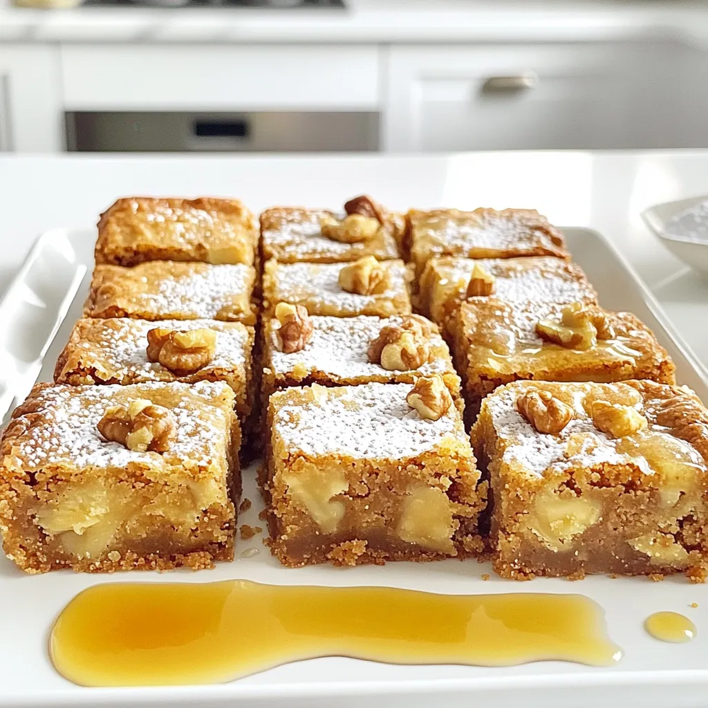 To make delicious maple brown sugar blondies, you need some key ingredients. These elements create a rich and sweet flavor that everyone will love. - 1 cup unsalted butter, melted - 1 cup brown sugar, packed - 1/2 cup granulated sugar - 1/4 cup pure maple syrup - 2 large eggs - 1 teaspoon vanilla extract - 2 cups all-purpose flour - 1 teaspoon baking powder - 1/2 teaspoon salt - Optional: 1 cup walnuts or pecans, chopped These ingredients work together to form a sweet, gooey treat. The combination of brown sugar and maple syrup gives it a warm, cozy flavor. Using unsalted butter helps control the saltiness, so we get just the right taste. If you want some crunch, add walnuts or pecans. They add a nice texture and complement the sweetness. I always recommend using pure maple syrup for the best flavor. It makes a big difference! Gather these ingredients before you start. This way, you’ll have everything ready to create your blondies. Happy baking! - Preheat your oven to 350°F (175°C). - Line a 9x13 inch baking pan with parchment paper. To start, it’s crucial to get your oven ready. Preheating ensures the blondies bake evenly. Lining the pan with parchment paper helps you lift the blondies out easily once they cool. - Combine melted butter, brown sugar, granulated sugar. - Stir in maple syrup, eggs, and vanilla extract. Next, you'll want to mix your wet ingredients. In a large mixing bowl, add melted butter, brown sugar, and granulated sugar. Mix them until smooth. Then, stir in maple syrup, eggs, and vanilla. This blend gives the blondies their rich flavor. - Whisk together flour, baking powder, and salt. - Gradually mix dry ingredients into the wet mixture. Now, let’s prepare the dry mix. In another bowl, whisk together the flour, baking powder, and salt. Slowly add these dry ingredients to the wet mixture. Mix until just combined. This step is key; you want to avoid overmixing for a soft texture. - Fold in chopped nuts (if using). - Pour batter into the pan and smooth the top. - Bake for 25-30 minutes; check for doneness with a toothpick. Finally, if you like nuts, fold in chopped walnuts or pecans. Pour the batter into the prepared pan and smooth the top. Bake in your preheated oven for 25-30 minutes. Use a toothpick to check for doneness. It should come out clean or with a few moist crumbs. This will tell you that your blondies are ready. To get the best texture in your blondies, avoid overmixing the batter. Overmixing can make them tough. Mix just until you see no dry flour. For the right bake, use the toothpick test. Insert a toothpick into the center after 25 minutes. If it comes out clean or with a few moist crumbs, they are ready. If it’s wet, bake a few minutes more. You can boost the flavor by adding chocolate chips or nuts. They add a nice crunch and richness. I love using walnuts or pecans in mine. Serve your blondies warm with a drizzle of maple syrup on top. Vanilla ice cream on the side makes it extra special. You can also dust with powdered sugar for a pretty touch. These small additions really make a big difference! {{image_2}} If you want a nut-free version of these blondies, you can easily switch out the nuts. Use seeds like sunflower or pumpkin seeds for crunch. These seeds still bring a nice texture without the allergens. You could also skip the nuts altogether. Your blondies will still taste sweet and rich. For chocolate lovers, add chocolate chips or cocoa powder to the batter. Just mix in one cup of chocolate chips before baking. You can also replace 1/4 cup of flour with cocoa powder. This change gives you a rich, chocolatey taste without losing the blondie texture. Each bite will be a delight! If you seek a healthier option, try using alternative sweeteners. You can use honey or coconut sugar instead of brown sugar. Whole wheat flour is another great swap. It adds fiber and nutrients while keeping the blondies soft. These changes let you enjoy a treat that is a bit better for you. To keep your blondies fresh, store them in an airtight container. This will help them stay soft and moist. You can place a piece of wax paper between layers if you stack them. This prevents sticking and makes for easy serving later. If you want to save blondies for later, freezing is a great option. First, let them cool completely. Cut the blondies into squares. Wrap each square in plastic wrap, then place them in a freezer bag. Label the bag with the date. They can last up to three months in the freezer. When you are ready to enjoy them, just thaw them in the fridge overnight. To get that fresh-baked taste, reheat blondies in the oven. Preheat the oven to 350°F (175°C). Place the blondies on a baking sheet. Heat for about 5-10 minutes. You can also microwave them for 10-15 seconds. This warms them up without drying them out. Enjoy your blondies warm and gooey! Maple brown sugar blondies are rich, sweet bars made with brown sugar and maple syrup. They have a soft, chewy texture. The taste is a mix of caramel and maple, making each bite delightful. Blondies are similar to brownies but lack cocoa. They are golden and creamy, perfect for dessert lovers. Yes, you can use other sugars, but it changes the taste. White sugar makes them less rich. Coconut sugar gives a hint of caramel flavor. Using honey or agave syrup may affect the texture. Each sugar brings its own unique taste and texture to the blondies. To check if the blondies are done, use a toothpick. Insert it into the center of the pan. If it comes out clean or with a few crumbs, they are ready. If the toothpick has wet batter, bake longer. Keep an eye on the edges; they should look set and slightly golden. For neat squares, let the blondies cool completely. Use a sharp knife to cut them. To prevent crumbling, score the top lightly first. Wipe the knife between cuts to keep the edges clean. This ensures beautiful, even pieces for serving. You now have a simple guide to making delicious maple brown sugar blondies. We cover