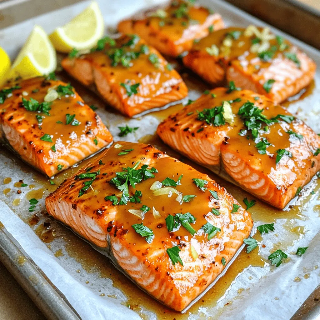 - 4 salmon fillets (about 6 ounces each) - 1/4 cup pure maple syrup - 2 tablespoons soy sauce (or tamari for gluten-free) - 3 cloves garlic, minced - 1 tablespoon fresh ginger, grated - 1 tablespoon olive oil - Salt and pepper - Fresh parsley or chives, chopped (for garnish) - Lemon wedges (for serving) When you gather your ingredients, focus on quality. Fresh salmon is key. Look for fillets that are bright and moist. Pure maple syrup brings a rich sweetness that pairs well with salmon. Choose a light soy sauce for a balanced flavor. Fresh garlic and ginger add depth and warmth. Olive oil helps combine everything and keeps the salmon moist. For seasoning, a sprinkle of salt and pepper enhances the salmon's natural taste. Fresh herbs like parsley or chives not only add color but also a fresh touch. Finally, lemon wedges bring brightness and acidity to your dish, making each bite pop. With these ingredients, you create a dish that feels special and tastes amazing. First, grab a mixing bowl. Add 1/4 cup of pure maple syrup, 2 tablespoons of soy sauce, 3 cloves of minced garlic, and 1 tablespoon of grated ginger. Whisk these ingredients well until they blend smoothly. This mix gives the salmon its sweet and savory flavor. Next, set aside half of this marinade for glazing later. This step is key to adding more flavor at the end. Now, take your 4 salmon fillets. Place them in a shallow dish. Pour the remaining marinade over the fillets. Make sure each piece is coated well. Cover the dish and let it marinate in the fridge for 30 minutes. This time allows the fish to soak up all the tasty flavors. While the salmon marinates, preheat your oven to 400°F (200°C). Get a baking sheet and line it with parchment paper or lightly grease it. After marinating, take the salmon out of the fridge. Place the fillets on the baking sheet, skin side down. Bake for 15 to 20 minutes. The salmon is done when it flakes easily with a fork. In the last 5 minutes of baking, brush the reserved marinade over the salmon. This adds an extra layer of yum. When the salmon is ready, take it out of the oven. Sprinkle with salt and pepper to taste. For a fresh touch, garnish with chopped parsley or chives. Serve hot with lemon wedges on the side for a bright finish. - Quality of ingredients used: Start with fresh salmon fillets. Use pure maple syrup, not imitation. Fresh garlic and ginger enhance the taste. Fresh herbs like parsley or chives add brightness. - Importance of marination time: Marinate the salmon for at least 30 minutes. This allows the flavors to soak in. If you have more time, marinate it for up to 2 hours. - Tips for perfect baking: Preheat your oven to 400°F (200°C). Line your baking sheet with parchment paper. Place the salmon skin-side down for even cooking. - Recommendations for checking doneness: Bake for 15-20 minutes. Check if the salmon flakes easily with a fork. It should be opaque in color. - Ideal side dishes: Serve with steamed broccoli or roasted asparagus. Quinoa or rice can make a great base. - Pairing flavors for a complete meal: Lemon wedges add brightness. A light salad with vinaigrette complements the dish well. {{image_2}} To make this recipe gluten-free, you can swap soy sauce for tamari or coconut aminos. Both options taste great and keep the dish safe for gluten-sensitive eaters. Tamari is richer and adds a nice depth of flavor. Coconut aminos is sweeter and milder. Both will blend well with the maple and garlic. You can take your glazed salmon to the next level by adding spices. A pinch of cayenne adds warmth without overpowering the dish. Smoked paprika brings a subtle smokiness that pairs well with the sweetness of maple. Fresh herbs like dill, mint, or basil can also brighten the flavors. Just mix them in the marinade or sprinkle over the top before serving. You have options when cooking this salmon. Grilling gives it a lovely char and smoky flavor. Just preheat your grill and cook the salmon for about six to eight minutes on each side. Baking is easier and requires less attention. It allows the salmon to cook evenly, especially in the oven at 400°F for 15-20 minutes. If you prefer pan-searing, heat some olive oil in a skillet. Cook the salmon skin-side down for about five minutes. Flip it over and cook for a few more minutes. Each method offers a unique taste and texture, so try them all! To keep your Maple Garlic Glazed Salmon fresh, use proper refrigeration techniques. First, let the salmon cool to room temperature. Then, place it in an airtight container. This helps keep moisture in and prevents odors from other foods. Store the salmon in the fridge. It will stay good for up to three days. When reheating the salmon, it's best to use gentle heat. The oven is a great choice. Preheat your oven to 300°F (150°C). Place the salmon on a baking sheet. Cover it with foil to keep it moist. Heat for about 10 minutes. This way, the salmon stays tender. Avoid overcooking it, as this can make it dry. Check it often to ensure it stays juicy. Yes, you can use frozen salmon. To thaw it, place the salmon in the fridge overnight. If you're short on time, you can seal the salmon in a bag and run it under cold water for about an hour. This keeps the fish safe and ready for cooking. You have a few good options if you want to swap maple syrup. Honey works well and adds a nice flavor. Agave syrup is another choice. Brown sugar mixed with water can also give you a sweet glaze. Just keep in mind that each option will change the taste a little. Look for a few signs to know your salmon is cooked. The fish should turn from a translucent pink to an opaque color. It should flake easily with a fork. If you have a food thermometer, aim for an internal temperature of 145°F (63°C) for perfect doneness. Yes, this recipe is great for meal prep. You can marinate the salmon a day ahead. Store the fillets in the fridge until you're ready to bake. Cooked salmon also keeps well. Just store it in an airtight contai