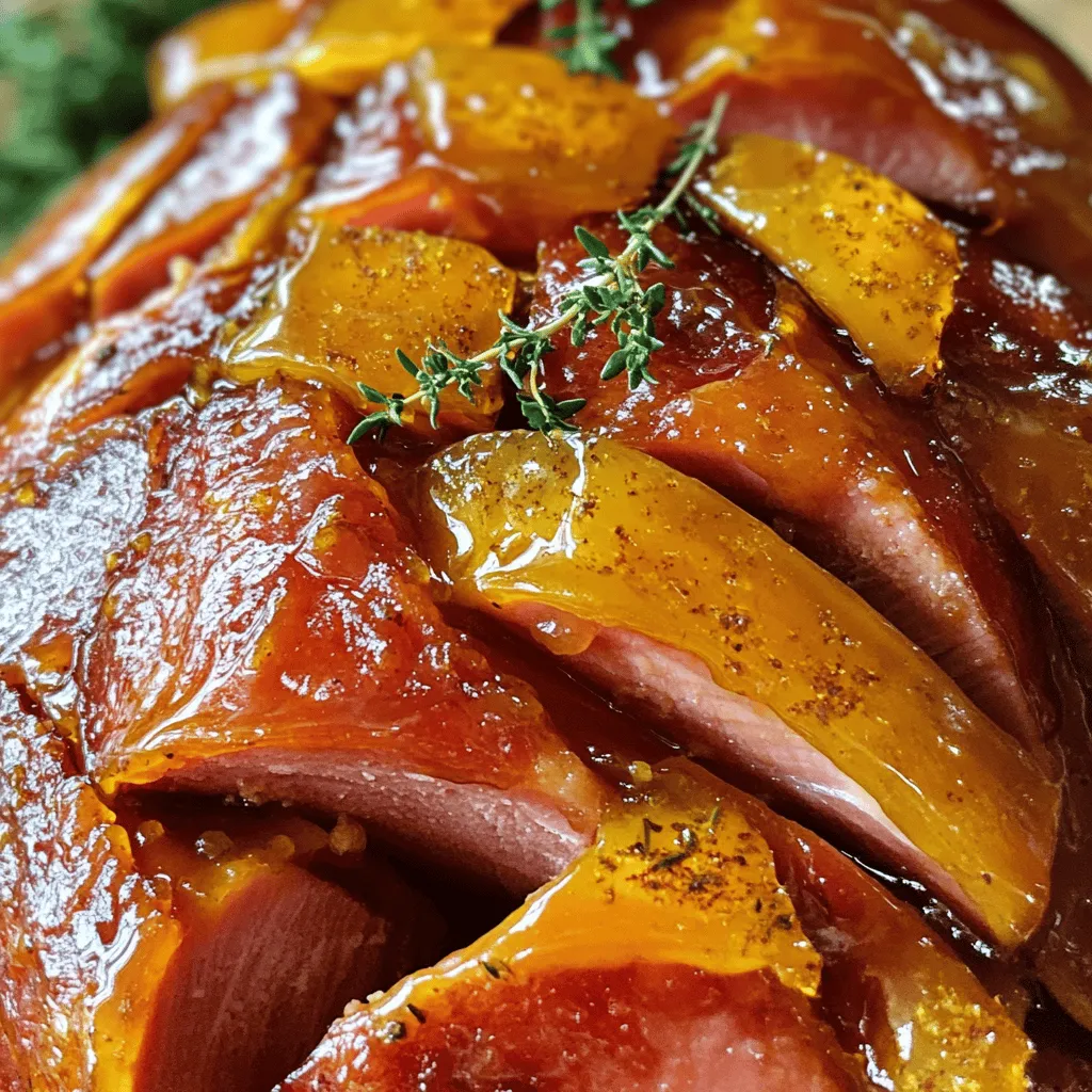 To keep the ham moist while it cooks, pour in 1/4 cup of water. This step is key for a juicy result. Finally, don’t forget fresh thyme. It makes a lovely garnish and adds a pop of color to your dish.