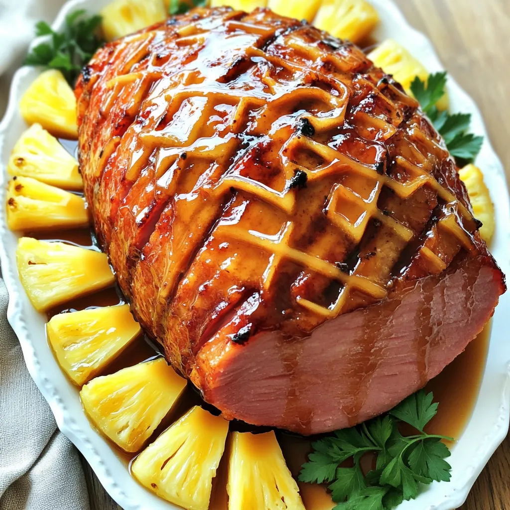 When you serve your ham, slice it into thick pieces. Place a pineapple ring on each slice for a lovely look. Garnish with fresh parsley for a pop of color. Pair the ham with sides like mashed potatoes or green beans for a complete meal. Enjoy this dish at holiday gatherings or family dinners. It always impresses!