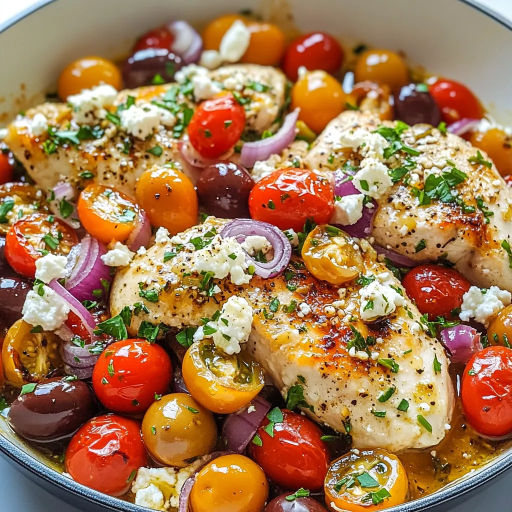 A flavorful chicken dish cooked in a skillet with olives, feta cheese, and fresh vegetables.
