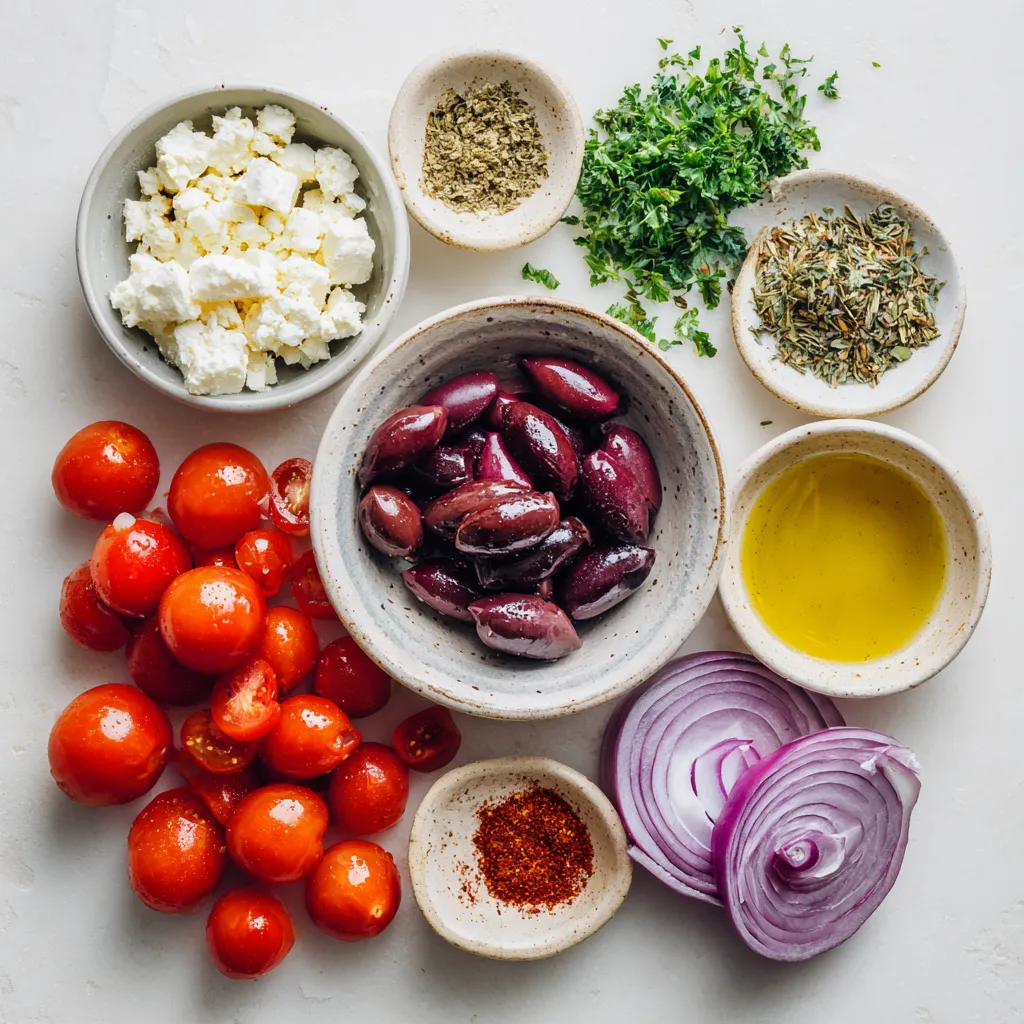 The main ingredients bring vibrant flavors to this dish. The chicken breasts provide a great protein base. Cherry tomatoes add sweetness, while Kalamata olives give a briny punch. Feta cheese adds creaminess and tang. Fresh red onion and garlic round out the flavor profile with a savory depth.