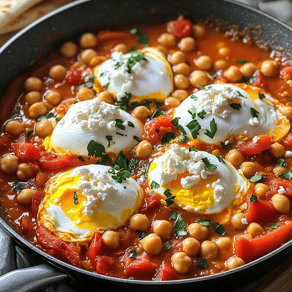 - 1 can (15 oz) chickpeas, drained and rinsed - 1 tablespoon olive oil - 1 medium onion, finely chopped - 2 cloves garlic, minced - 1 red bell pepper, diced - 1 teaspoon ground cumin - 1 teaspoon smoked paprika - 1/2 teaspoon cayenne pepper (optional, for heat) - 1 can (14 oz) diced tomatoes - 1 tablespoon tomato paste - Salt and pepper to taste - 4 large eggs - Fresh parsley, chopped (for garnish) - Feta cheese, crumbled (for garnish) - Pita bread or crusty bread (for serving) For this Mediterranean chickpea shakshuka, I love using fresh ingredients. You can find chickpeas in any grocery store. Look for cans that have no added salt for a cleaner taste. Fresh herbs like parsley can be found in the produce section. If you can't find chickpeas, lentils work well as a substitute. You can also switch the red bell pepper for green, yellow, or even zucchini. Each choice adds a new twist to the dish. Spices are key here. Ground cumin and smoked paprika bring warmth and depth. If you're not a fan of spice, skip the cayenne. This recipe is flexible and can adapt to your taste. This dish takes about 10 minutes to prep and 30 minutes to cook. You can work fast by gathering your ingredients first. Chop the onion, garlic, and bell pepper ahead of time. This saves time and makes cooking smoother. Key techniques for this recipe include sautéing and simmering. Sautéing brings out the flavor of the onion and garlic. Simmering helps meld the spices and tomatoes together. 1. Heat 1 tablespoon of olive oil in a large skillet over medium heat. 2. Add the finely chopped onion. Sauté it until it turns translucent, about 5 minutes. 3. Next, stir in 2 cloves of minced garlic and the diced red bell pepper. Sauté for another 3-4 minutes until the bell pepper softens. 4. Now, add 1 teaspoon of ground cumin, 1 teaspoon of smoked paprika, and 1/2 teaspoon of cayenne pepper if you like heat. Stir and cook for 1 minute until you smell the spices. 5. Pour in 1 can of diced tomatoes and add 1 tablespoon of tomato paste. Stir well and let it simmer for about 10 minutes. This helps the flavors mix. Season with salt and pepper to taste. 6. Stir in the drained and rinsed chickpeas. Cook for an additional 5 minutes to heat through. 7. Use a spoon to make small wells in the chickpea mixture. Crack 4 large eggs into each well. 8. Cover the skillet and cook for 5-7 minutes. This time will let the eggs cook to your liking, whether you want runny yolks or fully cooked eggs. 9. Once done, remove the skillet from heat. Sprinkle with fresh chopped parsley and crumbled feta cheese. 10. Serve the shakshuka warm with pita bread or crusty bread for dipping. Enjoy this flavorful Mediterranean dish! To make your Mediterranean Chickpea Shakshuka truly shine, focus on texture and flavor. Start by sautéing the onions until they are soft. This brings out their sweetness. Add garlic and bell pepper next. This step builds a rich base. Proper seasoning is key. Use salt and pepper to enhance the flavors. Add spices like cumin and smoked paprika for warmth. If you like heat, add cayenne pepper for a kick. Common mistakes include overcooking the eggs. Keep an eye on them. You want creamy yolks or fully cooked eggs, not rubbery ones. Also, don’t skip the fresh herbs and feta. They add a fresh taste. Pair your Shakshuka with a fresh salad. A simple cucumber and tomato salad works well. You can also serve it with hummus or tzatziki for extra flavor. The best bread for Shakshuka is pita or crusty bread. They are perfect for scooping up the sauce and eggs. For drinks, a light white wine pairs nicely. A sparkling water with lemon is also refreshing. Enjoy your meal with good company! {{image_2}} You can make Mediterranean Chickpea Shakshuka your own by adding extra veggies. Spinach or zucchini blend well and boost nutrition. Just chop them up and toss them in while you cook. For protein lovers, you can add sausage or tofu. Cook the sausage first until it’s browned. If using tofu, cube it and fry it lightly before mixing in. This way, you add a hearty touch to your dish. If you want a vegan option, you can swap the eggs. Use tofu or chickpea flour to create a scramble. Just mix the chickpea flour with water and seasonings, then cook it in the wells of the shakshuka. Experimenting with spices can elevate your shakshuka. Try different spice mixes like za'atar or harissa for a unique twist. Just sprinkle them in when you add the tomatoes. Want heat? Add hot sauce or a pinch of chili flakes. If you prefer sweetness, a dash of honey can balance the spices nicely. You can also add international flavors. Fresh Mediterranean herbs like basil or dill bring freshness. Different cheeses like goat cheese or mozzarella can change the taste too. Each choice adds its own charm to this dish. To keep your Mediterranean Chickpea Shakshuka fresh, store it in the fridge. First, let the dish cool down to room temperature. Then, use an airtight container. Glass containers work great since they don't stain or hold odors. You can also use plastic containers, but make sure they are BPA-free. This dish lasts about 3 to 4 days in the fridge. Always check for off smells or mold before eating leftovers. When reheating, you want to keep the flavor and texture just right. The oven is the best choice, as it warms the dish evenly. Preheat it to 350°F (175°C) and heat for about 15 minutes. If you use a microwave, cover the dish with a damp paper towel. Heat in short bursts of 1-2 minutes, stirring in between. This helps prevent overcooking the eggs. When serving reheated shakshuka, add fresh parsley or feta on top for a pop of flavor. Enjoy it warm with more pita or crusty bread! What is Shakshuka? Shakshuka is a tasty dish with eggs cooked in a spicy tomato sauce. It comes from North Africa and is popular in the Middle East. You enjoy it for breakfast, lunch, or dinner. The sauce often includes spices like cumin and paprika, giving it a rich flavor. Can I make Mediterranean Chi