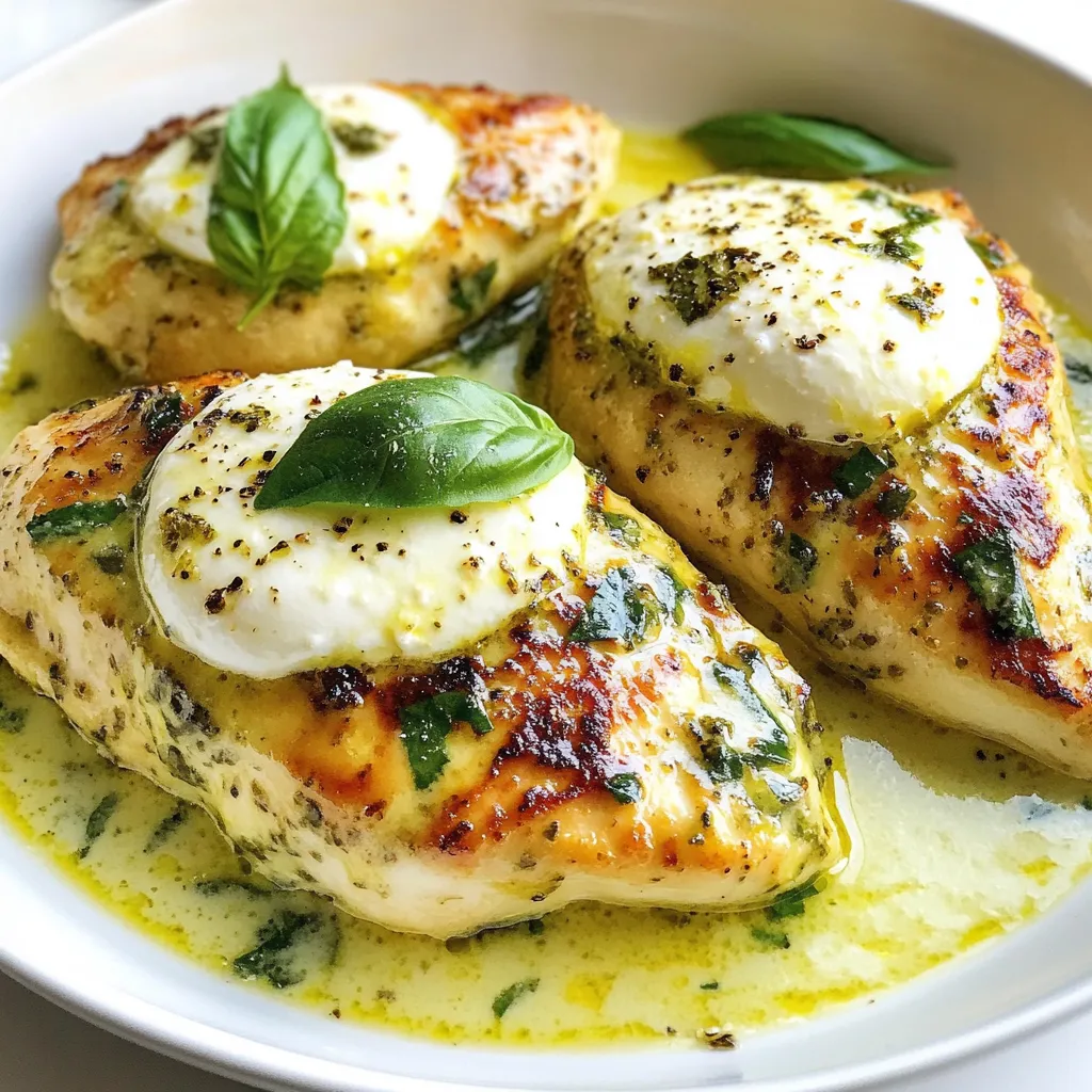 A delicious chicken dish featuring tender chicken breasts topped with fresh mozzarella in a creamy basil sauce.