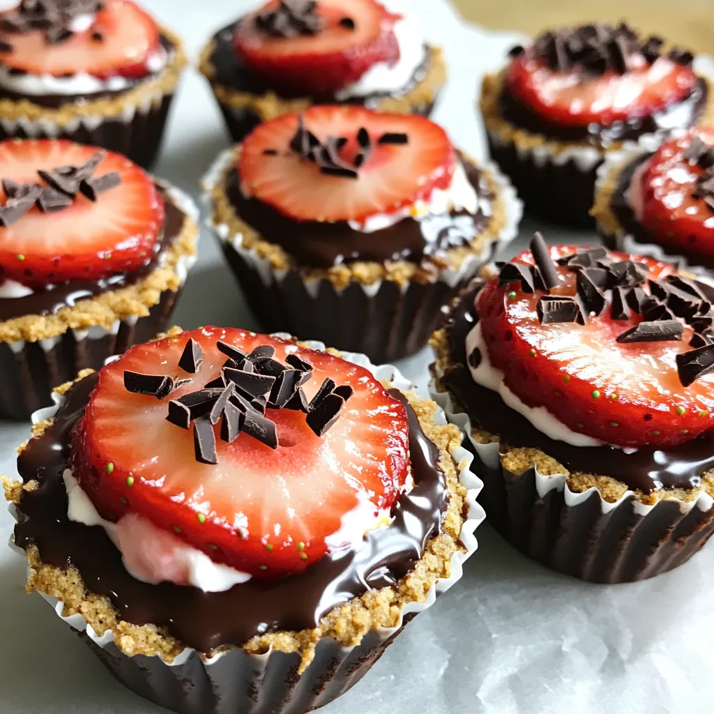 Take the chilled crusts out of the fridge. Spoon the cream cheese mixture evenly over each crust. Make sure to smooth the tops to create an even layer. Next, arrange the halved strawberries on top of the cream cheese. Finally, drizzle the melted chocolate over the strawberries. Coat them well to ensure every bite is delicious. Once assembled, put the cups back in the fridge for at least 30 minutes. This helps them firm up nicely. When ready, remove the cups from the muffin tin and peel away the liners. Enjoy your tasty no-bake chocolate covered strawberry cups!
