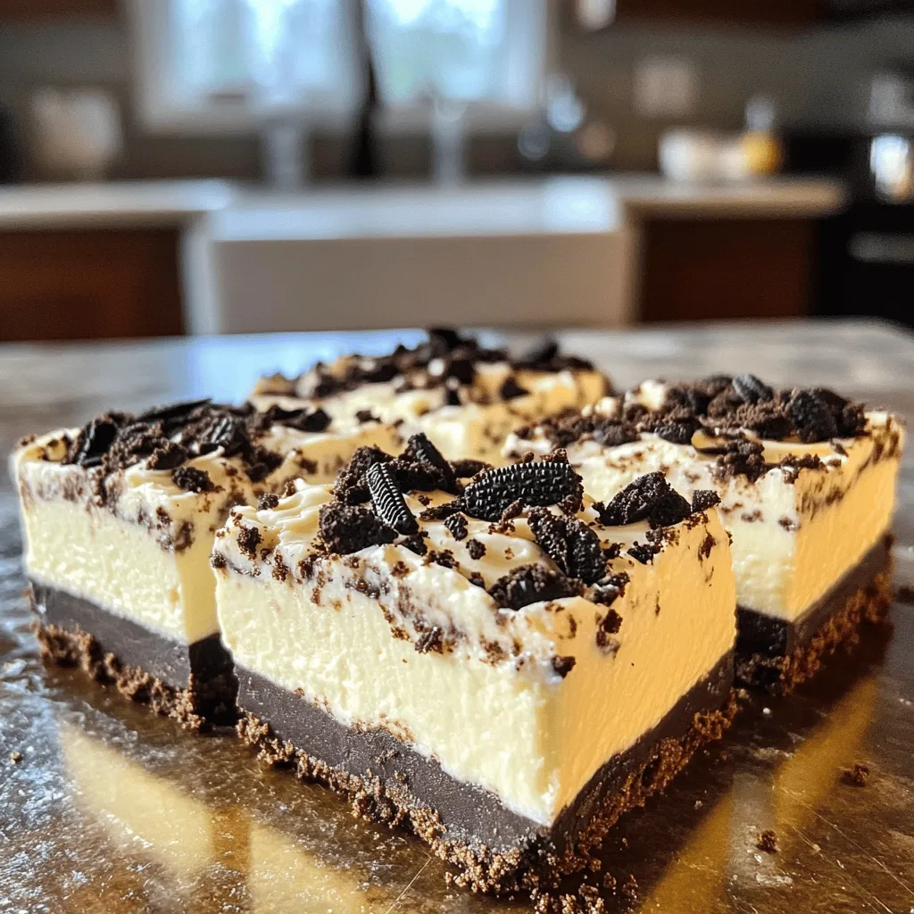 - 1 ½ cups Oreo cookie crumbs - ½ cup unsalted butter, melted - 16 oz cream cheese, softened - 1 cup powdered sugar - 1 teaspoon vanilla extract - 1 cup heavy whipping cream - 1 cup crushed Oreos for topping - Chocolate syrup for drizzling You can use chocolate syrup for a sweet touch. It adds a delicious layer of flavor. - Medium bowl for mixing the crust - Large mixing bowl for the filling - Electric mixer to beat the cream cheese - 9x9-inch baking pan for setting the bars - Plastic wrap to cover the pan These tools make the process easier and faster. Using the right tools helps you create a smooth cheesecake. To prepare the crust, start by mixing 1 ½ cups of Oreo cookie crumbs with ½ cup of melted butter in a medium bowl. You want to make sure each crumb is coated well. Next, take the mixture and press it firmly into the bottom of a greased 9x9-inch baking pan. This makes a great base for your cheesecake. After that, refrigerate the crust for about 15 minutes. This helps it to set and gives it a nice texture. Now, let's make the cheesecake filling. In a large mixing bowl, beat 16 oz of softened cream cheese with an electric mixer. Mix until it becomes smooth and creamy. Next, slowly add 1 cup of powdered sugar and 1 teaspoon of vanilla extract. Mix until everything blends well. In a separate bowl, whip 1 cup of heavy cream until it forms stiff peaks. This step is key for a light filling. Gently fold the whipped cream into the cream cheese mixture. Once combined, fold in 1 cup of crushed Oreos, but save some for later. This adds yummy bits of cookies in every bite. Pour the cheesecake filling over the chilled crust in your pan. Spread it out evenly for a nice finish. Then, sprinkle the reserved crushed Oreos on top. Gently press them into the surface. Cover the pan with plastic wrap and put it in the fridge. Let it chill for at least 4 hours, or until it sets firm. When ready, cut into bars and drizzle with chocolate syrup if you like. Enjoy your delicious no-bake cookies and cream cheesecake bars! To get a smooth texture, make sure your cream cheese is very soft. I let it sit out for about 30 minutes before mixing. This helps avoid lumps. When whipping the heavy cream, beat it until stiff peaks form. This makes your filling light and fluffy. Gently fold the whipped cream into the cream cheese mix. Use a spatula and fold, don’t stir. This keeps the air in the whipped cream. One common mistake is not chilling the crust long enough. If the crust is not set, it may crumble when you cut the bars. Another mistake is over-mixing the cream cheese. This can make your filling dense. Be careful when adding the crushed Oreos; add them gently to keep the texture nice. Lastly, don’t skip the chilling time after assembling. It’s key for firm bars. For a beautiful presentation, cut the bars into even squares. Drizzle chocolate syrup on top for a special touch. You can also sprinkle extra crushed Oreos over the bars. Serve them on a nice plate or platter. For a fun twist, use colorful sprinkles. They add a pop of color and fun. Enjoy these bars with friends for a perfect treat! {{image_2}} You can change up the cookies in this recipe. If you want a new taste, try using different cookies. Chocolate wafer cookies give a rich flavor. Vanilla wafers can add a light, sweet touch. You could even use graham crackers for a fun twist. Each option will change the taste of the crust. Just crush them like you do with Oreos and mix with melted butter. Toppings make these cheesecake bars even better. Instead of crushed Oreos, try crushed peanut butter cookies for a nutty flavor. You can also use sprinkles for a fun, colorful look. Fresh fruit, like raspberries or strawberries, adds a fresh taste. If you love chocolate, drizzle melted chocolate on top. These toppings can change the whole look and taste of your bars. Want to add some zing? Mix in a bit of lemon zest for a fresh kick. You can also try adding a tablespoon of espresso powder for a coffee flavor. If you enjoy a nutty taste, add chopped nuts to the filling. Each of these additions can help make the cheesecake bars unique and fun to eat. Experimenting with flavors keeps each batch fresh and exciting! To keep your no bake cookies and cream cheesecake bars fresh, store them in the fridge. Place them in an airtight container to protect against moisture and odors. If you use a baking pan, cover it tightly with plastic wrap. This keeps the bars from drying out. Avoid stacking them to prevent any squishing. When stored properly, these cheesecake bars will last about 5 days in the fridge. They taste best when fresh, but they will still be tasty after a few days. Check for any changes in texture or smell before eating. If they look or smell off, it’s best to toss them. You can freeze these bars for later enjoyment. First, cut them into individual portions. Wrap each piece tightly in plastic wrap, then place them in a freezer-safe bag or container. They can stay in the freezer for up to 3 months. When you’re ready to enjoy, let them thaw in the fridge overnight. This keeps them creamy and delicious. Yes, you can use low-fat cream cheese. It will change the taste and texture a bit. The bars may not be as rich, but they will still taste great. Keep in mind that the filling may be less creamy, so adjust your mixing time if needed. Aim for a smooth blend to ensure a nice texture. To make this recipe gluten-free, you can swap regular Oreos for gluten-free Oreos. The other ingredients are naturally gluten-free. Just double-check your cream cheese and powdered sugar for any gluten-containing additives. Follow the same steps for mixing and chilling. Your gluten-free bars will still be delicious! If you need a substitute for heavy cream, try using coconut cream or whipped coconut milk. Both options will add a different flavor. You can also use whole milk with a bit of melted butter. This will mimic the fat content of heavy cream. Mix well to keep the filling l