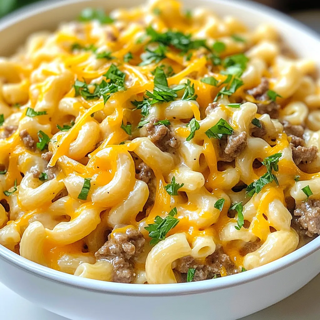 A creamy and cheesy macaroni dish with ground beef and spices.