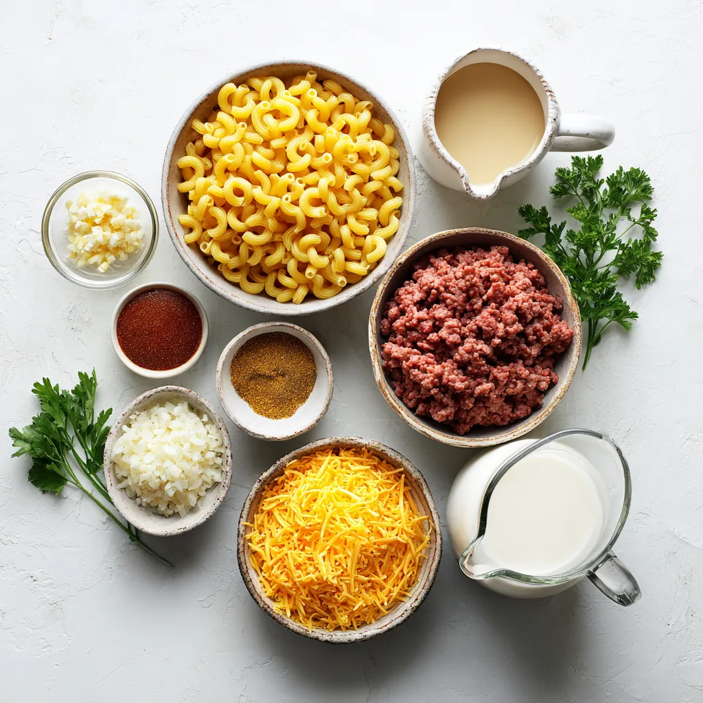 The main ingredient is elbow macaroni. It holds sauce well and cooks quickly. Ground beef gives a rich flavor and protein. Onion and garlic add depth and aroma to the dish. Beef broth keeps everything moist and tasty. Milk helps create a creamy texture. Cheddar cheese makes it cheesy and comforting. Worcestershire sauce adds a savory kick. Mustard powder and paprika enhance the overall taste.
