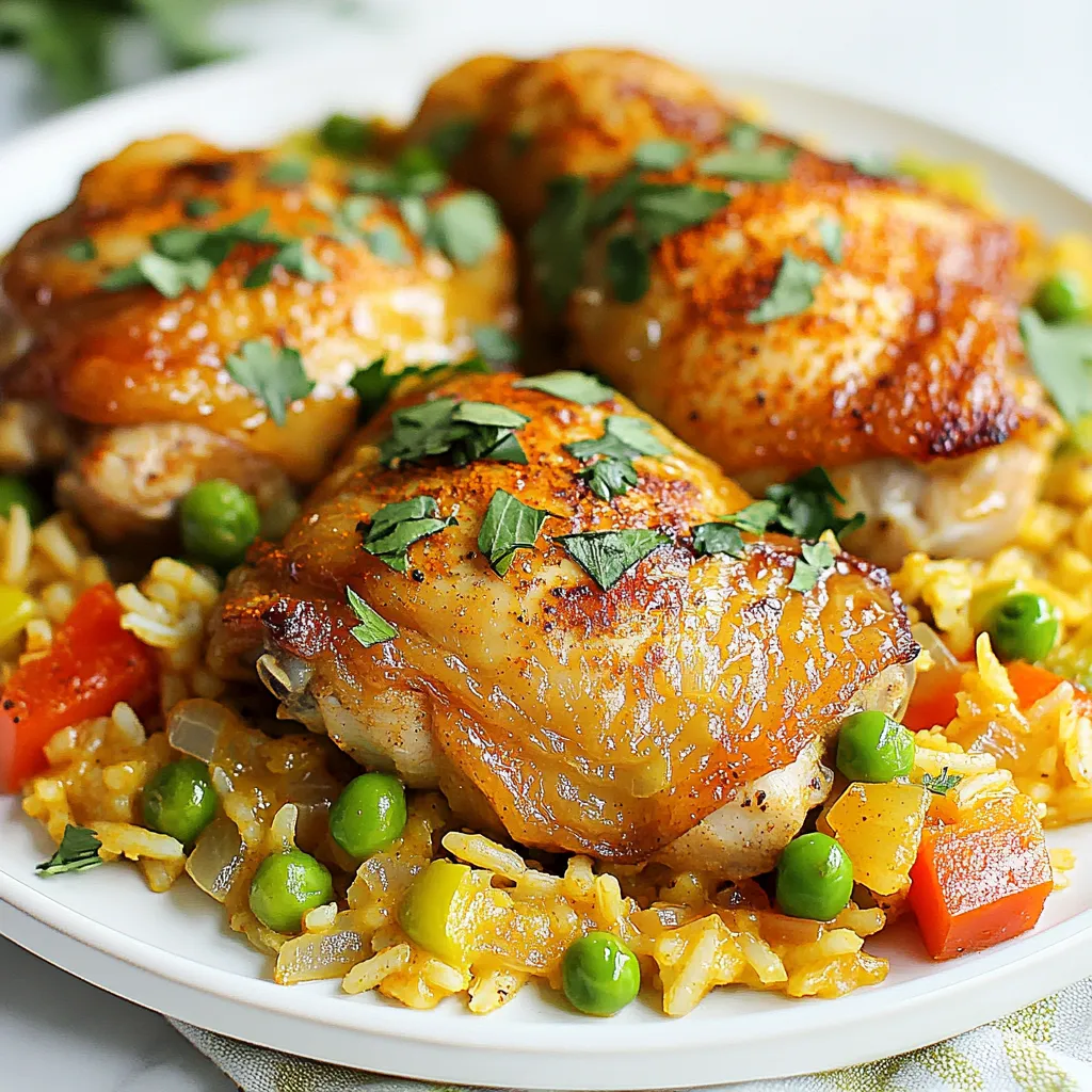 A flavorful and easy one-pot meal featuring chicken thighs and rice cooked with vegetables and spices.