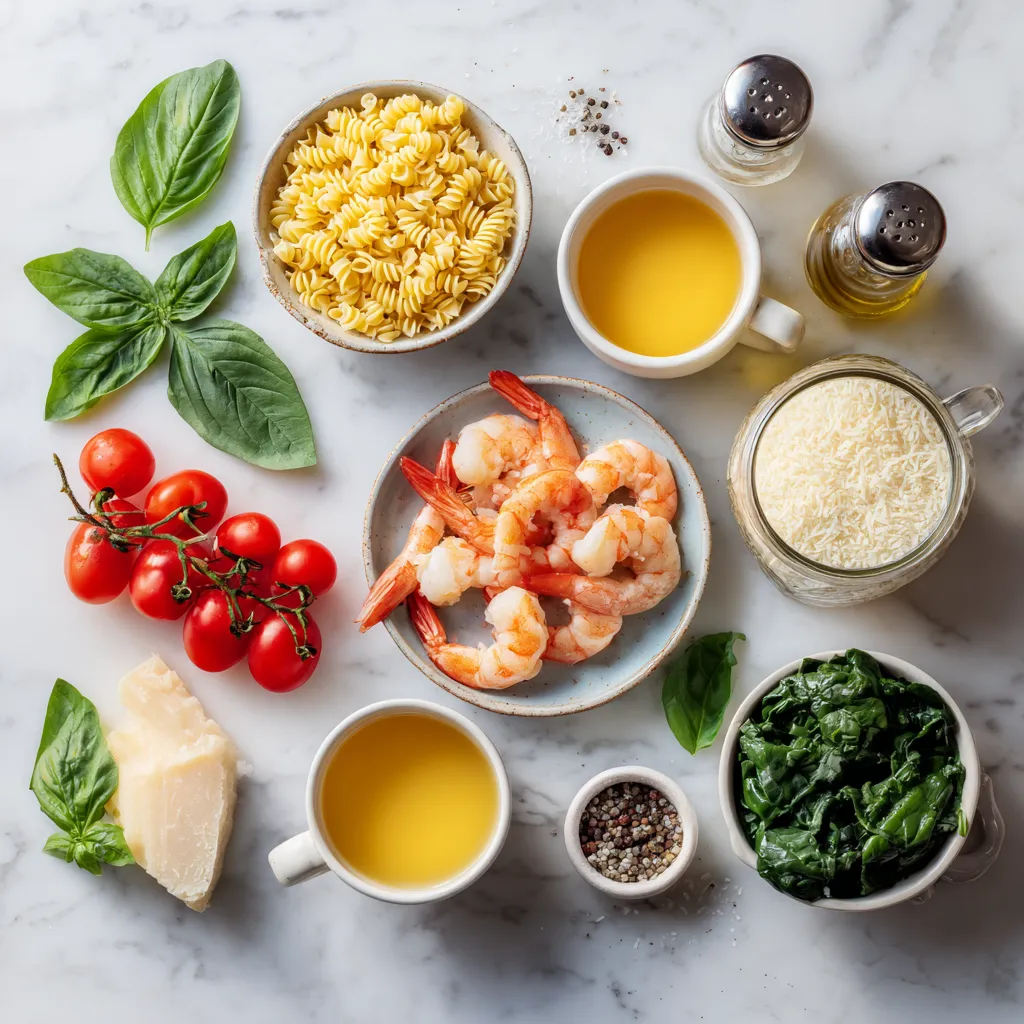 To create this dish, I start with fresh large shrimp. They give a nice texture and flavor. I also use orzo pasta, which cooks quickly and absorbs flavors well. Vegetable broth adds depth to the dish, while heavy cream makes it rich and creamy. The cherry tomatoes burst with sweetness, adding freshness.