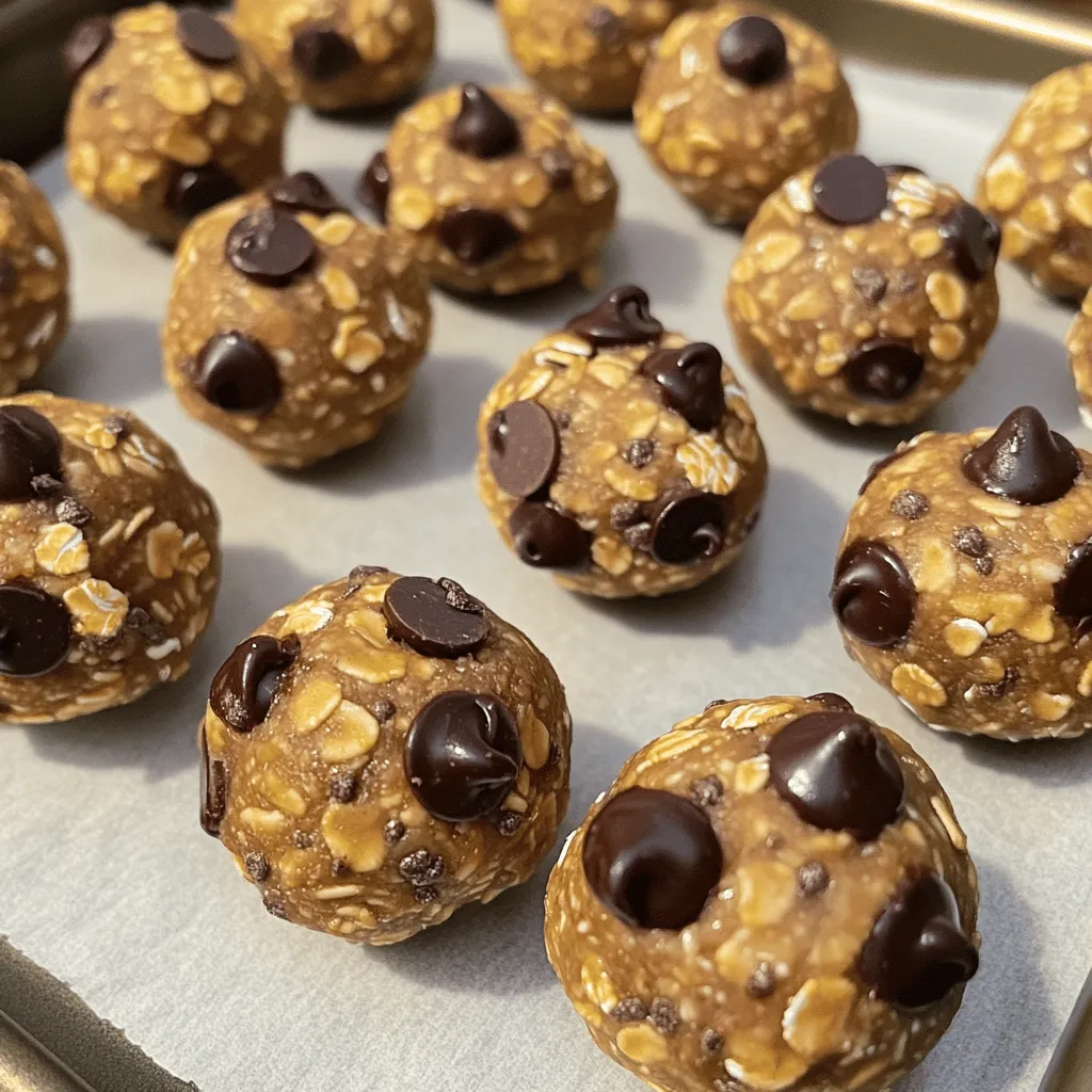 Pour the smooth peanut butter mixture into the dry ingredients. Stir until everything is mixed well. You should see no dry bits left. Now, fold in ½ cup of chocolate chips. Make sure they are evenly spread throughout. Next, use your hands to form the mixture into small balls, about 1 inch wide. If the mix is sticky, chill it in the fridge for about 30 minutes. This makes rolling easier. Place the formed bites on a parchment-lined baking sheet. Chill them in the fridge for about an hour to firm up. Enjoy these tasty energy bites as a quick snack!