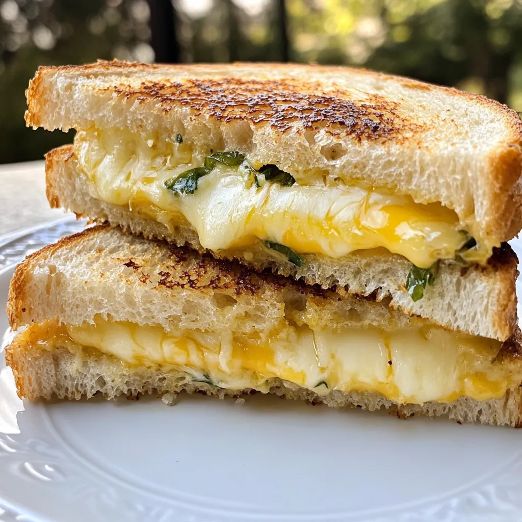 A deliciously cheesy and crispy grilled cheese sandwich with a hint of garlic and fresh basil.