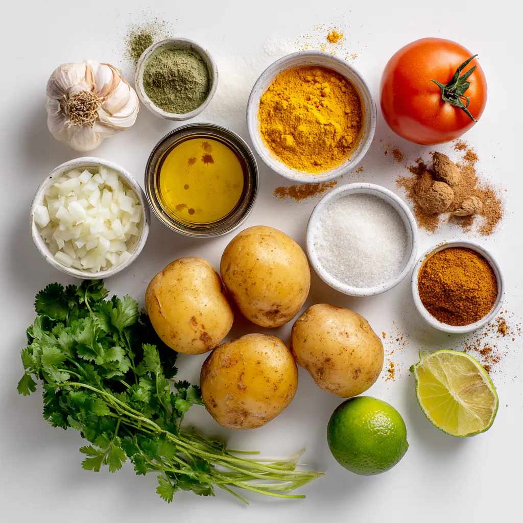 When making Persian potato curry, fresh and high-quality ingredients make a big difference. Start with firm, fresh potatoes. I prefer using medium-sized ones for even cooking and a nice texture. The onion adds sweetness, while garlic and ginger give depth to the dish. Diced tomatoes bring acidity and help create a sauce.