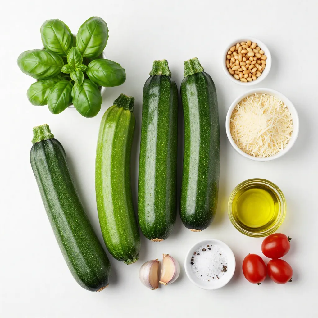 To make Pesto Parmesan Zucchini Noodles, gather these fresh ingredients: