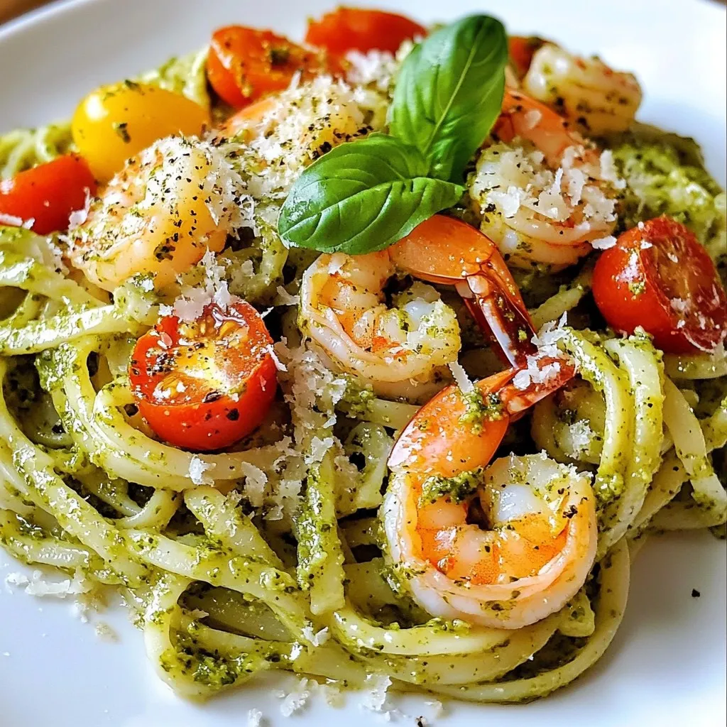 - 8 oz linguine or spaghetti - 1 lb large shrimp, peeled and deveined - 1 cup fresh basil pesto - 1 cup cherry tomatoes, halved - 2 cloves garlic, minced - 3 tablespoons olive oil - 1/4 teaspoon red pepper flakes (optional) - Salt and pepper to taste - Grated Parmesan cheese for serving - Fresh basil leaves for garnish Using fresh ingredients makes a big difference in taste. Choose shrimp that look moist and have a clean smell. Fresh basil should be vibrant and fragrant. For pasta, I suggest using high-quality brands for the best texture. Fresh garlic packs more flavor than powdered garlic. The pesto should be bright green and made from real basil. For shrimp, I like to use Wild American Shrimp. If you prefer a frozen option, look for shrimp that are raw and peeled. For pesto, brands like Classico or homemade are great. If you need a nut-free option, try sun-dried tomato spread instead of pesto. You can swap linguine for spaghetti or even gluten-free pasta if needed. {{ingredient_image_1}} To make pesto shrimp pasta, follow these steps carefully. First, boil a large pot of salted water. Add 8 oz of linguine or spaghetti. Cook it until it is al dente, about 8-10 minutes. Remember to reserve 1 cup of pasta water before draining. Set the pasta aside. Next, heat 2 tablespoons of olive oil in a large skillet over medium heat. Add 2 cloves of minced garlic. Sauté it for about 30 seconds until it smells good. Then, raise the heat to medium-high. Add 1 lb of large shrimp, seasoned with salt, pepper, and red pepper flakes if you want some heat. Cook the shrimp for 2-3 minutes on each side. They should turn pink and opaque. Now, add 1 cup of halved cherry tomatoes to the skillet. Cook them for an extra 2 minutes until they soften. After that, stir in 1 cup of fresh basil pesto. Mix everything well. Finally, add the drained linguine to the skillet. If the pasta looks dry, add some reserved pasta water until it is creamy. Toss it all together so every strand of pasta gets coated. For perfect pasta, use plenty of water. This helps the pasta cook evenly. Always add salt to the water. It enhances the pasta's flavor. Stir the pasta occasionally while it cooks. This keeps it from sticking together. Make sure to check the pasta a minute or two before the package time. It should be firm but tender, known as al dente. To cook shrimp properly, look for color change. Raw shrimp are grey and translucent. Cooked shrimp should be pink and opaque. They also curl slightly when done. Avoid overcooking; it makes shrimp tough. Cook them just until they reach this perfect state, which usually takes 2-3 minutes per side. To keep your pasta firm, cook it until it's al dente. This means it should be slightly firm to the bite. Make sure to boil it in plenty of salted water. Stir it often to prevent sticking. After draining, don’t rinse the pasta. Rinsing removes the starch that helps sauce stick. Seasoning is key to making your dish pop. Use salt and pepper well while cooking. A pinch of red pepper flakes adds a nice kick. You can also add fresh herbs like parsley or basil at the end for a burst of flavor. Don’t forget to taste as you go! Shrimp cooks fast, so timing is important. Heat your skillet to medium-high before adding shrimp. Cook them for 2-3 minutes per side. Look for that pink color and opaque look. Overcooking can make shrimp tough, so keep an eye on them. Pro Tips Use Fresh Ingredients: Fresh basil and quality shrimp make a significant difference in flavor. Always opt for fresh over frozen whenever possible. Don't Overcook the Shrimp: Shrimp cooks quickly; overcooking can make it rubbery. Cook just until pink and opaque for the best texture. Adjusting Creaminess: If the pasta seems dry, add the reserved pasta water a little at a time to achieve your desired creaminess without making it soupy. Garnish for Flavor: A sprinkle of fresh basil and grated Parmesan cheese not only enhances presentation but adds a burst of flavor at the end. {{image_2}} If you want a vegetarian twist, swap the shrimp for mushrooms. Use hearty types like portobello or cremini. For a vegan option, choose plant-based pesto. Look for brands that don’t use cheese. You can also blend your own with basil, nuts, and nutritional yeast. This keeps the fresh taste while making it plant-friendly. You can boost this meal by adding more proteins. Chicken works well; just grill or pan-sear it first. Tofu is another great option. Cut it into cubes and sauté until golden. Scallops or even crab can bring a fancy touch. Just be mindful of cooking times to avoid overcooking anything. While I love linguine or spaghetti, you can get creative with pasta shapes. Penne or fusilli hold sauces nicely too. If you want a gluten-free meal, try chickpea or lentil pasta. Whole wheat pasta adds fiber and a nutty taste. Just ensure you adapt cooking times for different types. To store your leftover pesto shrimp pasta, let it cool first. Use an airtight container. Keep it in the fridge for up to three days. Make sure it’s sealed tightly to keep flavors fresh. When you’re ready to enjoy your leftovers, reheat them gently. Use a skillet over low heat. Add a splash of water or olive oil to keep it moist. Stir well until heated through. You can also microwave it in short bursts. Heat for 30 seconds, then check and stir. You can freeze pesto shrimp pasta for later. Pack it in a freezer-safe container. Leave some space at the top, as it will expand when frozen. It can last for up to three months in the freezer. To use, thaw it in the fridge overnight and reheat as mentioned above. If you don't have basil pesto, try using sun-dried tomato pesto or arugula pesto. Both add a unique twist to your dish. You can also make a simple herb blend with parsley, garlic, and walnuts. Mix these with olive oil for a fresh taste. Yes, you can use frozen shrimp! Just make sure to thaw them first. Place them in cold water for about 15 minutes. This will help them cook evenly and t