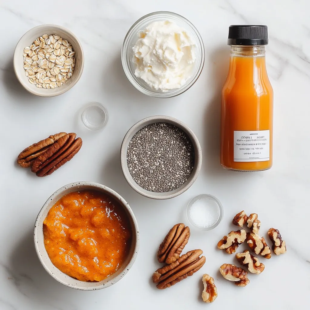 To make these tasty pumpkin pie overnight oats, start by gathering your ingredients. You need: