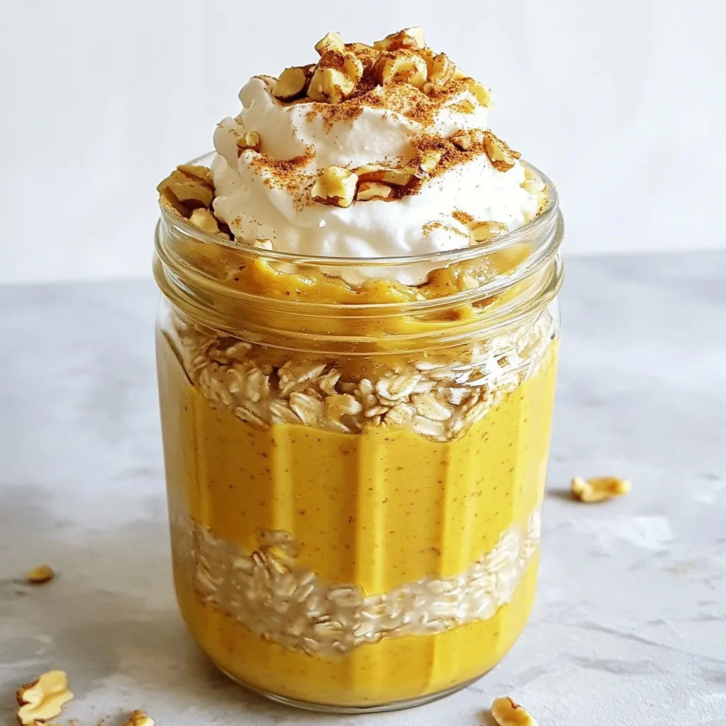 To make pumpkin pie overnight oats, you will need: - 1 cup rolled oats - 1 cup unsweetened almond milk (or any milk of choice) - 1/2 cup pumpkin puree (not pumpkin pie filling) - 1 tablespoon maple syrup (adjust for sweetness) - 1/2 teaspoon pumpkin pie spice - 1/4 teaspoon vanilla extract - 2 tablespoons chia seeds - Pinch of salt These ingredients create a creamy, delicious base that tastes like pumpkin pie. You can add fun toppings to your oats: - Chopped pecans - Whipped coconut cream - A sprinkle of cinnamon These toppings add texture and flavor. You can also swap in your favorites! To get the best taste, use fresh pumpkin puree. It gives a rich, true pumpkin flavor. Choose a good almond milk for creaminess. If you want it sweeter, adjust the maple syrup to your liking. Chia seeds help thicken your oats and add fiber. Always mix well so every bite is full of flavor! {{ingredient_image_1}} To make these tasty pumpkin pie overnight oats, start by gathering your ingredients. You need: - 1 cup rolled oats - 1 cup unsweetened almond milk (or any milk of choice) - 1/2 cup pumpkin puree (not pumpkin pie filling) - 1 tablespoon maple syrup (adjust for sweetness) - 1/2 teaspoon pumpkin pie spice - 1/4 teaspoon vanilla extract - 2 tablespoons chia seeds - Pinch of salt In a medium bowl, mix the rolled oats, almond milk, pumpkin puree, maple syrup, pumpkin pie spice, vanilla extract, chia seeds, and salt. Stir until everything blends well. Each oat should be coated in the pumpkin mix. Next, divide the mixture into two airtight containers or jars. Seal them tightly and place them in the fridge overnight. This step lets the oats soak up all the flavors. Store your pumpkin pie overnight oats in the fridge. They stay fresh for about 3 to 5 days. Make sure the containers are sealed well to keep the oats safe from other fridge odors. If you want to prepare them ahead of time, this is a perfect option. Just remember to stir the oats before serving. Sometimes, the liquids settle at the bottom. When you’re ready to enjoy your oats, take them out of the fridge. Stir them gently to mix any settled liquid back in. For a lovely touch, add toppings. I like to use chopped pecans for crunch, whipped coconut cream for creaminess, or a sprinkle of cinnamon for extra warmth. These simple additions make your breakfast both tasty and beautiful! Enjoy your pumpkin pie overnight oats chilled. They offer a nutritious start to your day or a satisfying snack! To make your pumpkin pie overnight oats shine, use high-quality pumpkin puree. Fresh or homemade puree can bring out a richer taste. You can also boost the flavor with a bit more pumpkin pie spice. A dash of nutmeg or ginger can add warmth and depth. Don't forget a small pinch of salt; it makes the sweet flavors pop! Everyone has different taste buds. If you want more sweetness, add an extra tablespoon of maple syrup. You can also try honey or agave syrup for a different twist. Remember, you can always taste as you mix. This way, you can find the perfect level of sweetness that you love! If you're dairy-free, almond milk works great, but feel free to use oat or coconut milk. For a nut-free option, use rice milk or hemp milk. If chia seeds aren't your thing, you can replace them with flaxseeds or skip them altogether. Just make sure to adjust the liquid to keep the right texture! Pro Tips Use Steel-Cut Oats for a Chewier Texture: If you prefer a heartier bite, consider substituting rolled oats with steel-cut oats. Just remember to increase the soaking time to ensure they soften adequately. Sweetness Control: Adjust the amount of maple syrup based on your preferences. You can also substitute it with honey or agave syrup for different sweetness profiles. Experiment with Spices: While pumpkin pie spice is a classic choice, feel free to add a pinch of nutmeg or ginger for an extra kick of flavor that complements the pumpkin. Make It a Meal Prep Star: This recipe is perfect for meal prep! Double the batch and store jars in the fridge for quick breakfasts throughout the week. {{image_2}} You can use many types of milk in this recipe. Almond milk is great, but you can also try coconut milk for a creamy taste. If you like cow's milk, whole milk works well too. For a nut-free option, oat milk is a nice choice. Each milk brings a different flavor, so feel free to explore! Spices and extracts can change your overnight oats. If you want a stronger taste, add more pumpkin pie spice. You can also try cinnamon or nutmeg for a warm flavor. A dash of ginger adds a nice kick. For a sweet twist, a little vanilla or maple extract makes it special. Mix and match to find your favorite blend! Adding nuts or fruits makes your oats even better. Chopped pecans or walnuts give a nice crunch and healthy fats. You can also add sliced bananas or berries for natural sweetness. Dried fruits like raisins or cranberries add chewiness. These add-ins boost nutrition and make each bite exciting! Store your pumpkin pie overnight oats in airtight containers. Glass jars work well. This keeps the oats fresh and prevents them from drying out. Make sure to seal the lids tightly to avoid spills. Keeping them in the fridge helps maintain flavor and texture. You can keep the oats in the fridge for up to five days. After that, they may lose their flavor and become mushy. If you notice any off smell or texture, it’s best to toss them. Always check before you eat to ensure they are still good. If you want to store the oats for longer, freezing is a great option. Place the oats in freezer-safe containers. Leave some space at the top. The oats will expand when frozen. You can keep them in the freezer for up to three months. When ready to eat, thaw them in the fridge overnight. Yes, you can use quick oats. Quick oats cook faster than rolled oats. They will make your oats softer. However, the texture will change. If you like a creamier feel, quick oats work well. Just remember, they absorb more liquid. You might 