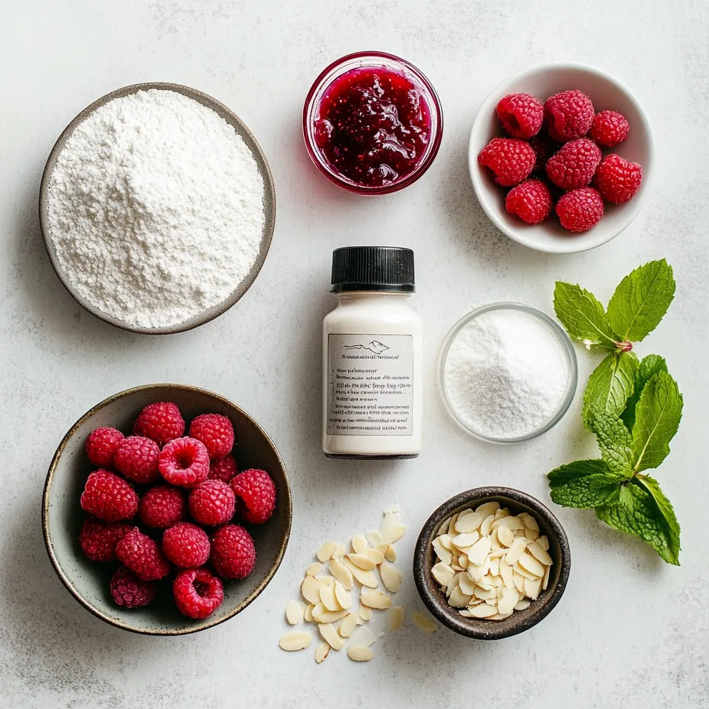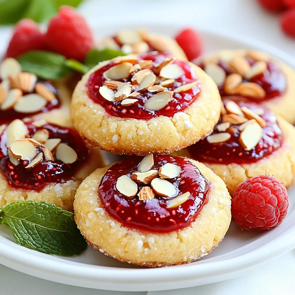 To make raspberry almond thumbprint cookies, you need the right ingredients. Here is the list: - 1 cup unsalted butter, softened - 1 cup powdered sugar - 1 teaspoon almond extract - 2 cups all-purpose flour - 1/2 teaspoon salt - 1/2 cup slivered almonds, toasted - 1/2 cup raspberry jam (or preserves) - Fresh raspberries and mint leaves for garnish (optional) Each ingredient plays a key role. The unsalted butter gives a rich base. The powdered sugar adds sweetness and a soft texture. Almond extract brings a lovely nutty flavor that pairs well with raspberry jam. All-purpose flour provides structure, while salt enhances the taste. Toasted slivered almonds add crunch and a lovely nutty finish. Finally, raspberry jam fills the center, creating a burst of flavor with each bite. You can also add fresh raspberries and mint leaves for a nice touch. These toppings make your cookies look pretty and add a fresh taste. With these ingredients, you will create a delightful treat that everyone will love. {{ingredient_image_1}} - Preheating the oven: Start by setting your oven to 350°F (175°C). This ensures even baking. - Lining baking sheets: Use parchment paper to line your baking sheet. This prevents sticking and makes cleanup easy. - Creaming butter and sugar: In a large bowl, mix 1 cup of softened butter with 1 cup of powdered sugar. Beat them together until the mix is light and fluffy. This adds air and makes the cookies soft. - Mixing in the almond extract: Add 1 teaspoon of almond extract to the butter and sugar mix. This gives your cookies a lovely flavor. Stir well to combine. - Combining dry ingredients: In another bowl, whisk together 2 cups of all-purpose flour and 1/2 teaspoon of salt. Slowly add this dry mix to the wet mix. Stir until everything is just combined. Don’t overmix, or your cookies may be tough. - Shaping the dough balls: Take about 1 tablespoon of dough and roll it into a ball. Place it on your lined baking sheet. Leave about 2 inches between each ball for spreading. - Creating thumbprints: Use your thumb or the back of a small spoon to press down in the center of each dough ball. Make a nice little well for the jam. - Filling with raspberry jam: Spoon a small amount of raspberry jam into each thumbprint. Fill it generously, but don’t let it overflow. - Adding toasted almonds: Press a few toasted slivered almonds around the edges of each thumbprint. This adds a great crunch and extra flavor. - Baking time and temperature: Place your baking sheet in the preheated oven. Bake for 12-15 minutes until the edges are lightly golden. Watch closely to avoid overbaking! - Importance of ingredient temperature: Always use softened butter. It helps mix well. Cold butter can make your cookies heavy. Let it sit out for 30 minutes. - Checking cookie doneness: Keep an eye on the edges. They should be lightly golden. The centers may look soft; they will firm up as they cool. - If cookies spread too much: If your cookies spread too much, the dough may be too warm. Chill the dough for 30 minutes. This helps keep their shape while baking. - Fixing dry or crumbly dough: If the dough feels dry, add a bit of milk. Just a tablespoon at a time will help. Mix it in well until the dough holds together. - Garnishing options: You can add fresh raspberries on top for color. A sprig of mint adds a nice touch, too. These make your cookies look fancy! - Serving suggestions: Serve them on a pretty plate for tea time. They also make great gifts in a cookie jar. Enjoy with coffee or milk for a sweet treat! Pro Tips Chill the Dough: For even better texture, chill the dough for about 30 minutes before shaping the cookies. This helps prevent spreading during baking. Use Quality Jam: Choose a high-quality raspberry jam or preserves for a rich flavor. Homemade jam can elevate the taste even further! Toasting Almonds: Toast the slivered almonds in a dry skillet over medium heat for a few minutes until golden. This enhances their flavor and adds a delightful crunch. Storage Tips: Store the cookies in an airtight container at room temperature for up to a week. For longer storage, freeze them without the jam and add the jam before serving. {{image_2}} You can change the jam in these cookies. Use strawberry or apricot for a new taste. Each jam brings its own flavor. Try orange marmalade for a citrus twist. You can also play with extracts. Use vanilla instead of almond for a different vibe. You might even mix extracts for fun flavors. If you need gluten-free cookies, swap all-purpose flour with a gluten-free blend. Look for one that works well in baking. This change keeps the cookies soft and tasty. For a vegan option, replace butter with coconut oil. Use a plant-based milk and add flaxseed meal for binding. These swaps still give you a great cookie. Make these cookies festive for the holidays. Add cinnamon or nutmeg for warmth. You can also add orange or lemon zest for a fresh touch. These spices give a seasonal feel. Decorate with colored sugar for a fun look. They will brighten up your holiday table. To keep your raspberry almond thumbprint cookies fresh, store them in an airtight container. This helps keep moisture out and keeps them soft. You can use a plastic or glass container with a tight lid. Line the bottom with parchment paper for extra care. Also, store them in a cool, dry place. Avoid areas with high humidity, as this can make the cookies soggy. At room temperature, these cookies last about one week. If you want them to last longer, consider freezing them. They can stay fresh in the freezer for up to three months. Just make sure to wrap them well in plastic wrap or foil before placing them in a freezer bag. To enjoy the cookies again, thaw them in the fridge overnight. This keeps their texture nice. If you prefer warm cookies, you can reheat them for a few seconds in the microwave. Be careful not to overheat them. Serve with a fresh raspberry or a sprig of mint for a lovely touch after storage. Yes, you 