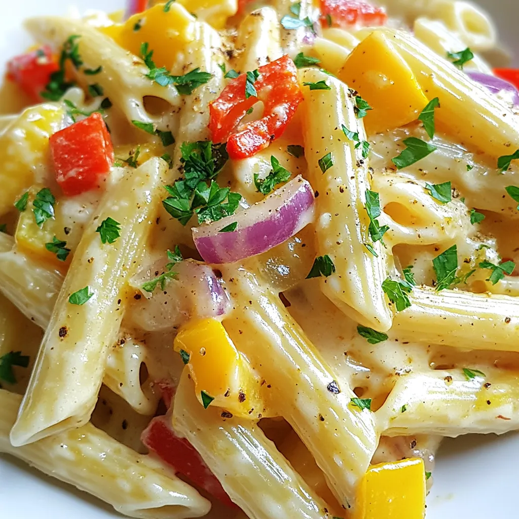 A colorful and creamy pasta dish with vibrant bell peppers and spices.