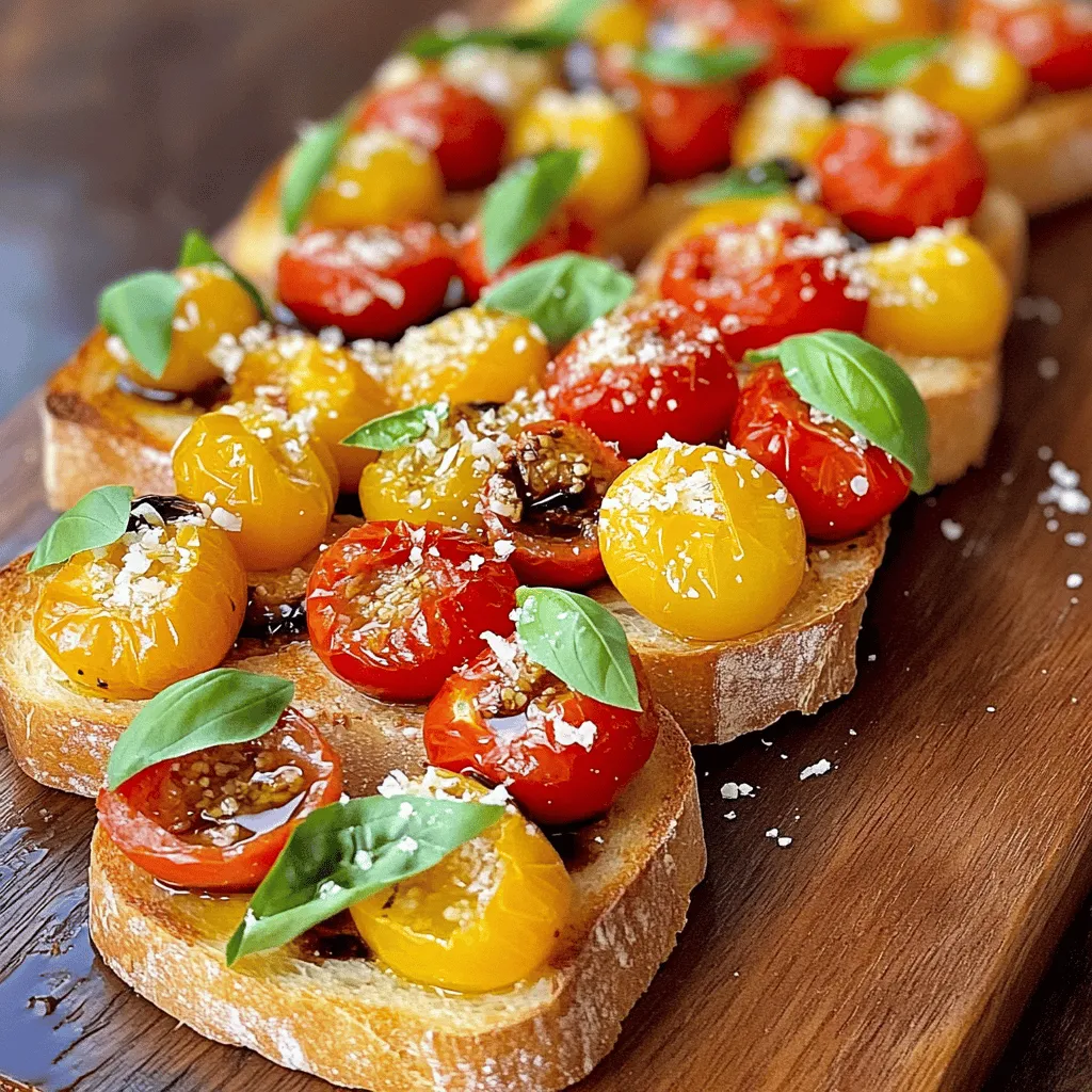 Each ingredient plays a key role. The baguette provides a crispy base. Cherry tomatoes add bright flavor and juiciness. Garlic gives a rich, sweet depth after roasting. Olive oil enhances the taste and texture. Balsamic vinegar brings a tangy sweetness. Salt and pepper are essential for seasoning. Fresh basil adds a burst of herbal freshness. Finally, Parmesan cheese can boost the flavor even more.