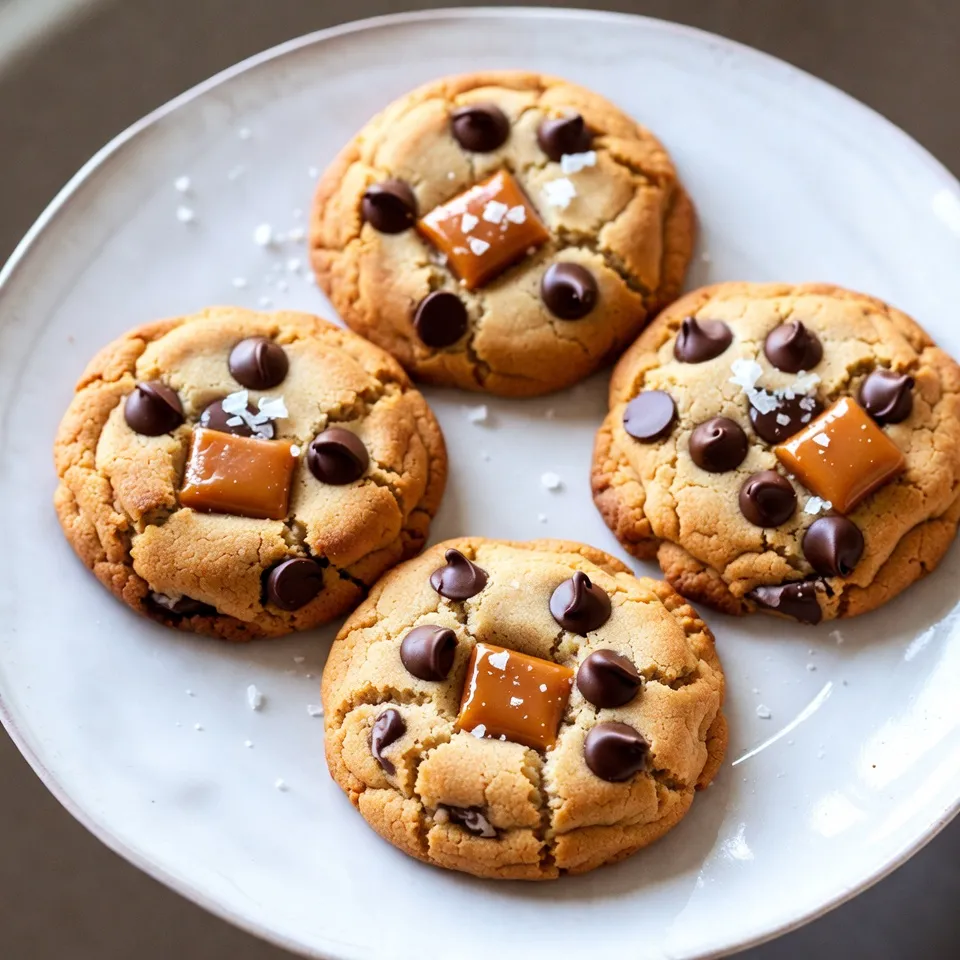 Vanilla extract brings warmth and sweetness. All-purpose flour is the base, and baking soda helps the cookies rise. Sea salt enhances the flavors, balancing the sweetness. Semi-sweet chocolate chips add a delightful bite, and soft caramel candies create gooey pockets of joy. Finally, the extra sea salt on top makes every bite pop.