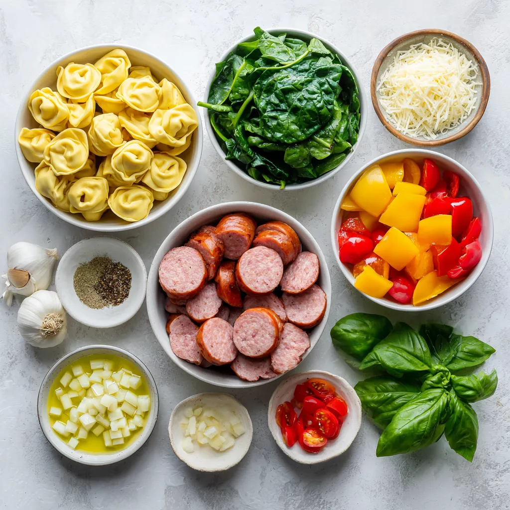 To make this dish, I love using fresh or frozen cheese tortellini. You can find it in most stores. The kielbasa sausage adds a nice smoky flavor. I slice it up to help it cook evenly. Fresh spinach brings a pop of color and nutrition. Cherry tomatoes add sweetness and juiciness. A diced bell pepper gives crunch and taste. Minced garlic adds depth and aroma.