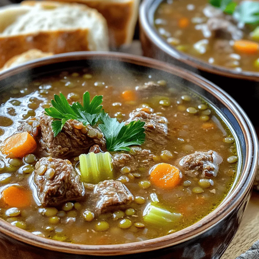 - 1 pound beef chuck, cut into 1-inch cubes - 1 cup green or brown lentils, rinsed and drained - 1 large onion, diced - 2 carrots, chopped - 2 celery stalks, chopped - 4 cloves garlic, minced - 1 can (14.5 oz) diced tomatoes (no salt added) - 6 cups beef broth (low sodium) - 2 teaspoons ground cumin - 1 teaspoon smoked paprika - 1/2 teaspoon dried thyme - 1 bay leaf - Salt and pepper to taste - 2 tablespoons olive oil - Fresh parsley for garnish (optional) If you want to swap ingredients, here are some great options: - Use beef stew meat instead of chuck for a leaner choice. - Swap lentils for split peas if you prefer a different texture. - You can use vegetable broth for a lighter flavor. - If you don’t have fresh garlic, garlic powder works too. When picking ingredients, look for these signs: - Choose beef that is bright red with no brown spots. - Lentils should be clean and dry, with no broken pieces. - For veggies, look for firm carrots and celery with vibrant colors. - Fresh garlic should feel hard and have no sprouting. - Always check broth for low sodium to keep the soup healthy. Using fresh ingredients can make your soup taste even better! Start by cutting your beef chuck into 1-inch cubes. This size helps the meat cook well. Next, heat a skillet over medium heat. Add 2 tablespoons of olive oil. Once hot, add the beef cubes. Brown them for about 5-7 minutes. This step brings out a rich flavor. You want a nice sear on all sides. After browning, transfer the beef to your slow cooker. Now, it’s time to prepare the vegetables. Dice 1 large onion, chop 2 carrots, and 2 celery stalks. Mince 4 cloves of garlic. Rinse and drain 1 cup of green or brown lentils. These lentils add texture and protein to the soup. In the slow cooker, add the browned beef. Then, add the diced onion, chopped carrots, chopped celery, and minced garlic. Next, include the rinsed lentils and 1 can of diced tomatoes. Make sure to add the juice from the can too. Then, sprinkle in 2 teaspoons of ground cumin, 1 teaspoon of smoked paprika, and 1/2 teaspoon of dried thyme. Don’t forget to toss in a bay leaf, salt, and pepper to taste. Now, pour in 6 cups of low-sodium beef broth. Ensure all the ingredients are submerged in the broth. This helps them cook evenly and absorb flavors. Cover the slow cooker with its lid. You have two options for cooking: set it on low for 8-10 hours or high for 4-5 hours. Cooking on low gives flavors a chance to deepen. On high, the soup cooks faster but may not be as rich. Check the soup towards the end of cooking time. The lentils and beef should be tender. Before serving, remove the bay leaf. Taste your soup and adjust the seasoning with more salt and pepper if needed. Serve hot and garnish with fresh parsley for a nice touch. Enjoy! To get the best taste in your soup, start by browning the beef. This step adds deep flavor. Use a skillet over medium heat with olive oil. Brown the beef cubes for about 5-7 minutes. Then, add fresh herbs and spices. Ground cumin and smoked paprika work wonders. They add warmth and depth. Don’t forget to season well with salt and pepper. Always taste your soup before serving. This way, you can adjust the seasoning to your liking. One common mistake is not rinsing the lentils. Always rinse them to remove dust and debris. Another mistake is overcooking the soup. If you cook it too long, the lentils can turn mushy. Keep an eye on the cooking time. If you want a soup with chunks, avoid using too much liquid. Remember, the soup thickens as it cooks. Lastly, don’t skip the bay leaf. It adds a subtle flavor that enhances the whole dish. If your soup is too thin, there are easy ways to thicken it. One method is to mash some of the lentils against the side of the slow cooker. This adds body without changing the taste. You can also add a slurry of cornstarch and water. Mix one tablespoon of cornstarch with two tablespoons of cold water. Stir this into the soup and let it cook for 10 more minutes. Another option is to let the soup cook uncovered for a while. This helps reduce the liquid and thickens the soup naturally. {{image_2}} You can change the beef in this soup. Try using chicken or turkey. These meats cook well and keep the soup tasty. You can also use beans like kidney or black beans. Just make sure to cook them until soft. If you use canned beans, add them in the last hour of cooking. This way, they stay whole and firm. To make a vegetarian or vegan version, skip the beef. Use mushrooms instead. Their rich flavor adds depth. You can also use lentils as the main protein. A mix of green and brown lentils works best. To boost flavor, add vegetable broth. You can even toss in plant-based sausage for extra taste. Adding more veggies is a great idea. Try spinach, kale, or zucchini. These greens add vitamins and minerals. You can also add bell peppers, sweet potatoes, or corn for sweetness. Chop them small and toss them in the slow cooker. They will cook well and add color to your soup. More veggies mean more nutrition and taste! After enjoying your soup, let it cool down to room temperature. Then, pour the soup into an airtight container. This helps keep flavors fresh. Store it in the fridge for up to three days. If you want to eat it later, consider freezing it. To reheat your soup, pour it into a pot over medium heat. Stir it often to warm it evenly. You can also use the microwave. Just make sure to heat it in short bursts and stir in between. This helps avoid hot spots and keeps it tasty. For long-term storage, freeze the soup in freezer-safe bags or containers. Be sure to leave some space at the top because soup expands. It can last in the freezer for up to three months. When ready to eat, thaw it overnight in the fridge. Then, reheat it as described above. Enjoy your warm meal on a cold day! Yes, you can make this soup on the stovetop. To do this, brown the beef in a large pot. Add the onion, carrots, celery, garlic, and lentils. Stir in the diced tom