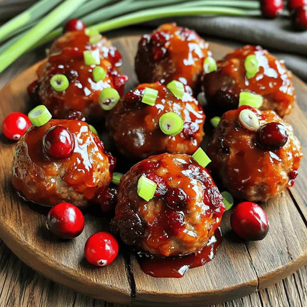 To make these tasty cranberry glazed meatballs, you will need: - 1 lb ground beef or turkey - 1/2 cup breadcrumbs - 1/4 cup chopped fresh parsley - 1/4 cup grated Parmesan cheese - 1 large egg - 1 teaspoon garlic powder - 1 teaspoon onion powder - Salt and pepper to taste - 1 cup cranberry sauce (homemade or store-bought) - 1/4 cup barbecue sauce - 1 tablespoon soy sauce - 1 teaspoon dried thyme You can add some fun touches to your dish with these garnishes: - Fresh cranberries - Chopped green onions Don’t worry if you need to swap some items! Here are some ideas: - Use ground chicken or pork instead of beef or turkey. - If you lack fresh parsley, try dried parsley or skip it. - For a gluten-free option, pick gluten-free breadcrumbs. - You can replace Parmesan with a dairy-free cheese for a vegan option. - If you want less sugar, use unsweetened cranberry sauce. Feel free to mix and match based on what you have at home! To start, grab a large mixing bowl. Add 1 pound of ground beef or turkey. Next, mix in 1/2 cup of breadcrumbs, 1/4 cup of chopped fresh parsley, and 1/4 cup of grated Parmesan cheese. Crack in 1 large egg, then sprinkle 1 teaspoon of garlic powder and 1 teaspoon of onion powder. Don’t forget to add salt and pepper to taste. Mix everything well until it comes together. Now, it’s time to shape the mixture. Use your hands to roll the meat into 1-inch balls. Place each meatball on a plate or baking sheet. Make sure they are evenly sized for cooking. This helps them cook at the same rate. For the glaze, take a separate bowl. Whisk together 1 cup of cranberry sauce, 1/4 cup of barbecue sauce, 1 tablespoon of soy sauce, and 1 teaspoon of dried thyme. Mix until smooth. This glaze adds a sweet and tangy flavor to the meatballs. Before you cook, spray the inside of the slow cooker with non-stick spray. Lay the meatballs in a single layer. Pour the cranberry glaze over them, making sure they are well coated. Cover the slow cooker. Cook on low for 4-5 hours or on high for 2-3 hours. The meatballs should be cooked through and tender. Once they are ready, carefully remove them with a slotted spoon. Serve hot, and if you like, drizzle extra glaze over the top. For a nice touch, garnish with fresh cranberries and chopped green onions. To make the best meatballs, use fresh ingredients. Start with ground beef or turkey. Mixing the meat with breadcrumbs helps keep them moist. Add parsley and Parmesan for flavor. The egg acts as a binder. Always season with salt and pepper. Shape the meatballs to about 1 inch. This size cooks evenly and stays juicy. Prevent meatballs from sticking by using non-stick spray. Coat the slow cooker well before adding meatballs. Place them in a single layer for even cooking. You can also add a bit of water to the bottom of the cooker. This extra moisture helps create steam, which keeps everything from sticking. Serve these meatballs hot for the best flavor. You can drizzle extra cranberry glaze over them. Garnish with fresh cranberries or chopped green onions. These add color and a fresh taste. Pair them with rice, pasta, or crusty bread for a complete meal. Enjoy them as an appetizer or a main dish! {{image_2}} You can change the taste by using different meats. Ground beef and turkey work well. Try using ground chicken or pork for a twist. Each meat adds its own flavor to the dish. Just remember to adjust the cooking time if needed. You can make these meatballs vegan or vegetarian. Use plant-based ground meat or lentils as a base. Mix in breadcrumbs, chopped vegetables, and spices. You can use vegan sauces for the glaze. This option is just as tasty and satisfying. You can enhance the flavor of your meatballs easily. Add herbs like basil or oregano for extra taste. Try mixing in some chopped onions or bell peppers. A dash of hot sauce can add a nice kick. Experiment with spices to find your favorite combination. To store leftover meatballs, let them cool first. Place them in an airtight container. Keep them in the fridge. They will last for about 3 to 4 days. Make sure they are covered to prevent drying out. To reheat the meatballs, use the microwave or the stovetop. If using a microwave, heat them on medium power for 1 to 2 minutes. Check if they are warm all the way through. On the stovetop, add a little water or sauce in a pan. Heat on low until warm. Stir often to keep them moist. You can freeze these meatballs for later meals. Start by letting them cool completely. Place them in a freezer-safe bag or container. Label the bag with the date. They can stay in the freezer for about 3 months. When ready to use, thaw them in the fridge overnight before reheating. Yes, you can use frozen meatballs. They work well in this recipe. Just place them in the slow cooker without thawing. Add the cranberry glaze on top and cook. You may need to add extra time to ensure they heat through. Cranberry glazed meatballs pair well with many sides. Here are some great options: - Rice (white or brown) - Mashed potatoes - Pasta - Salad - Bread rolls These sides help soak up the tasty glaze and make a full meal. To check if the meatballs are cooked, use a meat thermometer. The center should reach 165°F. If you don’t have a thermometer, cut one open. The meat should be brown, and the juices should run clear. This ensures they are safe to eat. In this post, we covered how to make tasty cranberry glazed meatballs. We discussed the main ingredients and some optional toppings. You learned to prepare the meatball mix, shape them, and create a tasty glaze. I shared tips to perfect your meatballs and avoid sticking, along with fun meal ideas. Remember, you can try different meats or go vegetarian! With these steps, you can store or freeze extra meatballs for later. Enjoy your cooking journey!