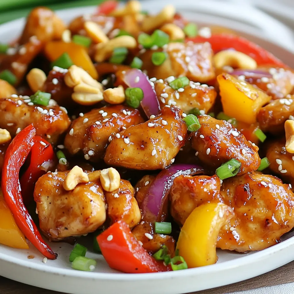 - 1 lb chicken breast, cut into bite-sized pieces - 1 cup unsalted cashews - 2 bell peppers (red and green), sliced - 1 medium red onion, sliced - 3 cloves garlic, minced - 1 tablespoon ginger, grated - 1/4 cup soy sauce (or tamari for gluten-free) - 2 tablespoons honey or maple syrup - 1 tablespoon vegetable oil - 1 teaspoon cornstarch - 1 tablespoon sesame oil - Salt and pepper to taste - 2 green onions, chopped (for garnish) - Sesame seeds (for garnish) Chicken breast gives a tender bite, but you can use thighs for more flavor. Unsalted cashews add crunch without extra salt. For a twist, try peanuts or almonds. Bell peppers come in many colors; use your favorites or whatever you have. Red onion adds sweetness, but yellow or white onions work too. Soy sauce is key for savory flavor. Choose tamari if you're gluten-free. Honey adds sweetness, but maple syrup is a great swap for vegan diets. Vegetable oil helps with cooking, but olive oil is a good choice too. Cornstarch thickens the sauce, but you can skip it if you prefer. Sesame oil enhances flavor; just don’t use too much. Adjust salt and pepper based on your taste. For accuracy, use a kitchen scale for the chicken. A measuring cup works well for cashews and liquids. When measuring sticky ingredients like honey, lightly oil the cup first. Use a microplane for ginger to get a smooth texture. Keep salt minimal until the end; you can always add more. Remember to chop ginger and garlic finely to release their flavors. If you don’t have a measuring spoon for sesame oil, a small spoon works fine. Use fresh green onions for a bright garnish; they really pop on the plate. {{ingredient_image_1}} To start, gather your ingredients. You need chicken, cashews, bell peppers, and onion. Cut the chicken into bite-sized pieces. Slice two bell peppers, one red and one green. Slice one medium red onion. Mince three cloves of garlic and grate one tablespoon of ginger. In a large bowl, mix the chicken with soy sauce, honey (or maple syrup), vegetable oil, garlic, ginger, salt, and pepper. Toss everything together until the chicken is fully coated. This mix gives your chicken a great flavor! Next, preheat your oven to 425°F (220°C) and line your baking sheet with parchment paper. This makes cleanup easy. Spread the marinated chicken out on the sheet in a single layer. This step is key for even cooking. Then, scatter the sliced bell peppers and onion over the chicken. Put the baking sheet in the preheated oven. Bake for 20 to 25 minutes. You want the chicken to be cooked through and the veggies tender. In the last five minutes, sprinkle the cashews over the chicken and veggies. This will toast the cashews nicely. While everything bakes, mix cornstarch and sesame oil in a small bowl until smooth. Once the chicken is done, drizzle this mixture over the pan. It adds a nice glossy look. Carefully take the sheet out of the oven. Let it cool a bit, then garnish with chopped green onions and sesame seeds. For the best results, cut your chicken into even pieces. This way, they will cook at the same speed. Spread the chicken and veggies in a single layer on the baking sheet. Avoid crowding them. If they are too close, they will steam instead of roast. Keep an eye on the chicken as it cooks. If you notice it's browning too fast, lower the oven temperature slightly. This will help you achieve tender and juicy chicken every time. To get the best flavor, marinate your chicken for at least 30 minutes. This allows the soy sauce, honey, garlic, and ginger to soak in. If you have time, marinate it for a few hours or even overnight. Always toss the chicken well to coat it evenly. This ensures each piece gets that tasty flavor. Toasting cashews brings out their rich flavor. Use a dry pan over medium heat. Add the cashews and stir them often. Keep a close eye on them. They can burn fast! Toast them for about 5-7 minutes until golden brown. Once done, remove them to cool. This helps keep them crunchy in your dish. Serve your sheet pan cashew chicken straight from the oven. It looks great and stays warm. You can also transfer it to a platter for a nice touch. Pair it with steamed rice or quinoa to soak up the sauce. For extra color, add fresh herbs on top. Green onions and sesame seeds make a lovely garnish! Pro Tips Marinate for Flavor: For an even deeper flavor, marinate the chicken for at least 30 minutes or up to overnight in the refrigerator before cooking. Use Fresh Ingredients: Fresh garlic and ginger will enhance the dish's aroma and taste. Avoid powdered versions for the best results. Customize Your Veggies: Feel free to mix and match your favorite vegetables, such as broccoli or snap peas, to add more color and nutrients. Check Doneness: Ensure the chicken is cooked through by checking that it reaches an internal temperature of 165°F (75°C) for safety. {{image_2}} You can easily make this dish gluten-free. Just swap soy sauce for tamari. Tamari tastes similar but has no gluten. This small change keeps the flavor intact and still delicious! Feel free to get creative with veggies. Add broccoli for crunch or snap peas for sweetness. Carrots or zucchini also work well. Mix and match to brighten your dish and add nutrition! If you want to change the protein, try shrimp or tofu. Both options soak up the flavors nicely. Use firm tofu for the best texture. Adjust cooking time slightly to ensure everything cooks perfectly. To store leftovers, let the dish cool first. Then, place it in an airtight container. You can keep it in the fridge for up to three days. This helps maintain the taste and texture of the chicken and veggies. To reheat, use the oven for best results. Preheat to 350°F (175°C). Spread the leftovers on a baking sheet. Heat for about 10-15 minutes. Make sure the chicken is hot all the way through. You can also use a microwave if you’re in a hurry. Heat in 30-second intervals until warm. You can freeze this dish, but it’s best to freeze it before addi