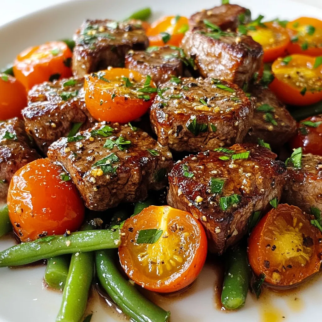 For this recipe, you need fresh and simple items. Here’s what you will need: - 1 lb sirloin steak, cut into bite-sized pieces - 4 tablespoons unsalted butter - 4 cloves garlic, minced - 1 teaspoon fresh rosemary, chopped - 1 teaspoon fresh thyme, chopped - Salt and pepper to taste - 1 tablespoon olive oil - 1 cup cherry tomatoes, halved - 1 cup fresh green beans, trimmed These ingredients work together to create a tasty dish. The sirloin steak gives a nice flavor and texture. The garlic and herbs add wonderful aroma and taste. The seasoning is key to great flavor. Use fresh herbs like rosemary and thyme. These herbs add depth and a fresh taste. Don't forget the salt and pepper! They balance the flavors. The olive oil helps the steak bites to cook evenly and adds richness. For a fresh touch, consider adding garnishes. Chopped parsley adds color and a hint of freshness. You can also sprinkle some extra herbs if you want. These small touches make the dish look beautiful and appealing. {{ingredient_image_1}} First, gather your ingredients. You need 1 pound of sirloin steak, cut into bite-sized pieces. Grab 4 tablespoons of unsalted butter, and 4 cloves of minced garlic. Don't forget 1 teaspoon each of fresh rosemary and thyme. Add salt and pepper to taste. You will also need 1 tablespoon of olive oil, 1 cup of halved cherry tomatoes, and 1 cup of trimmed green beans. Finally, have 2 tablespoons of chopped parsley for garnish. Start by preheating your oven to 400°F (200°C). Line a baking sheet with parchment paper to make cleanup easy. Take a large bowl and mix the steak bites with olive oil, minced garlic, rosemary, thyme, salt, and pepper. Toss them well until the steak is fully coated with the mix. Spread the seasoned steak bites evenly on one side of the baking sheet. On the other side, place the cherry tomatoes and green beans. Drizzle these veggies with a bit of olive oil. Add salt and pepper for taste. Cut the butter into small pieces and place it over the steak bites. Now it’s time to bake! Place the sheet pan in the oven and bake for about 12-15 minutes. For best results, flip the steak bites halfway through cooking. This helps them cook evenly. You want the steak to reach a medium-rare doneness for the best flavor and tenderness. Once cooked, remove the sheet pan from the oven. Let it rest for a few minutes before serving. Top your dish with fresh parsley for a nice touch. Enjoy your delicious meal! For this recipe, I recommend using sirloin steak. Sirloin is tender and flavorful. You can also try ribeye. Ribeye has more fat, which adds taste but may be richer. Always look for good marbling in the meat. This makes your bites juicy and delicious. Cut the steak into uniform pieces. This helps them cook evenly. Garlic butter is key for flavor. Use fresh garlic for the best taste. Mince the garlic finely so it spreads well. Mix it with softened butter before adding it to the steak. The heat will melt the butter, mixing the flavors. Add fresh herbs like rosemary and thyme. They bring out the garlic's rich notes and make every bite special. When cooking vegetables, cut them into even sizes. This ensures they cook at the same rate. For this recipe, use cherry tomatoes and green beans. They cook quickly and pair well with steak. Toss them in olive oil and season them well. This enhances their natural sweetness. Remember to space them out on the sheet pan. This helps them roast instead of steam. Pro Tips Resting the Steak: Allow the steak bites to rest for a few minutes after baking. This helps redistribute the juices, ensuring a more flavorful bite. Choosing the Right Cut: Sirloin is a great choice for this recipe, but you can also use ribeye for a richer flavor and tenderness. Vegetable Variations: Feel free to swap out cherry tomatoes and green beans for seasonal vegetables like bell peppers or zucchini for added color and nutrition. Butter Infusion: For an extra layer of flavor, consider using flavored butter, such as garlic herb butter, to dot on the steak bites before baking. {{image_2}} You can change the herbs to boost flavor. I love using fresh basil or oregano. Both add a nice twist. You can mix in dried herbs if fresh ones are not available. Just use less, as dried herbs are stronger. Try adding a pinch of smoked paprika for a warm, deep flavor. You can use different veggies to match your taste. Bell peppers add sweetness and color. Zucchini slices are great for a soft bite. Mushrooms bring a nice umami flavor. Just cut them to similar sizes to cook evenly. Always remember to season the veggies well. If you like it hot, add some red pepper flakes. Just a pinch can make a big difference. For more heat, slice fresh jalapeños or serrano peppers. Toss them in with the steak. You can also try a splash of hot sauce before serving for an extra kick. To store your leftover steak bites, let them cool completely. Place the bites in an airtight container. Make sure to separate the veggies. This helps keep everything fresh. Store in the fridge for up to three days. When you are ready to eat, you want them to taste great. To reheat your steak bites, preheat your oven to 350°F (175°C). Place the steak and veggies on a baking sheet. Cover with foil to keep moisture in. Heat for about 10 minutes. This keeps the steak tender and juicy. You can also use a microwave. Heat in short bursts so you don’t overcook them. If you want to freeze your steak bites, make sure they are cool. Place them in a freezer-safe bag or container. Remove as much air as you can. They will stay good in the freezer for up to three months. When you're ready to eat, thaw them overnight in the fridge. Reheat them as mentioned above. This way, you can enjoy a delicious meal later! To keep your steak bites tender, start with good quality meat. Choose sirloin, as it cooks well. Cut the steak into even pieces. This helps them cook evenly. Marinate the steak for at least 30 minutes. Use olive oil, garlic, and herbs for fl