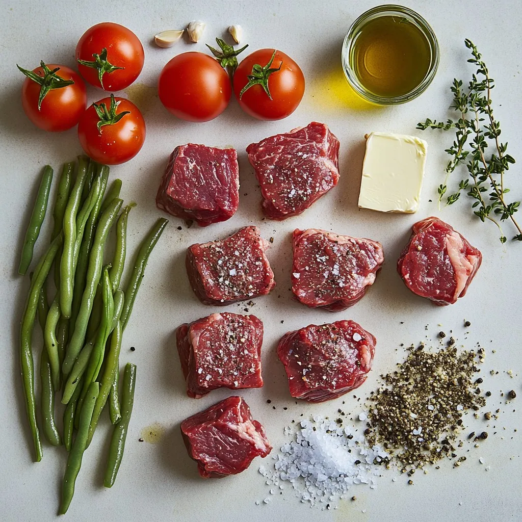 First, gather your ingredients. You need 1 pound of sirloin steak, cut into bite-sized pieces. Grab 4 tablespoons of unsalted butter, and 4 cloves of minced garlic. Don’t forget 1 teaspoon each of fresh rosemary and thyme. Add salt and pepper to taste. You will also need 1 tablespoon of olive oil, 1 cup of halved cherry tomatoes, and 1 cup of trimmed green beans. Finally, have 2 tablespoons of chopped parsley for garnish.