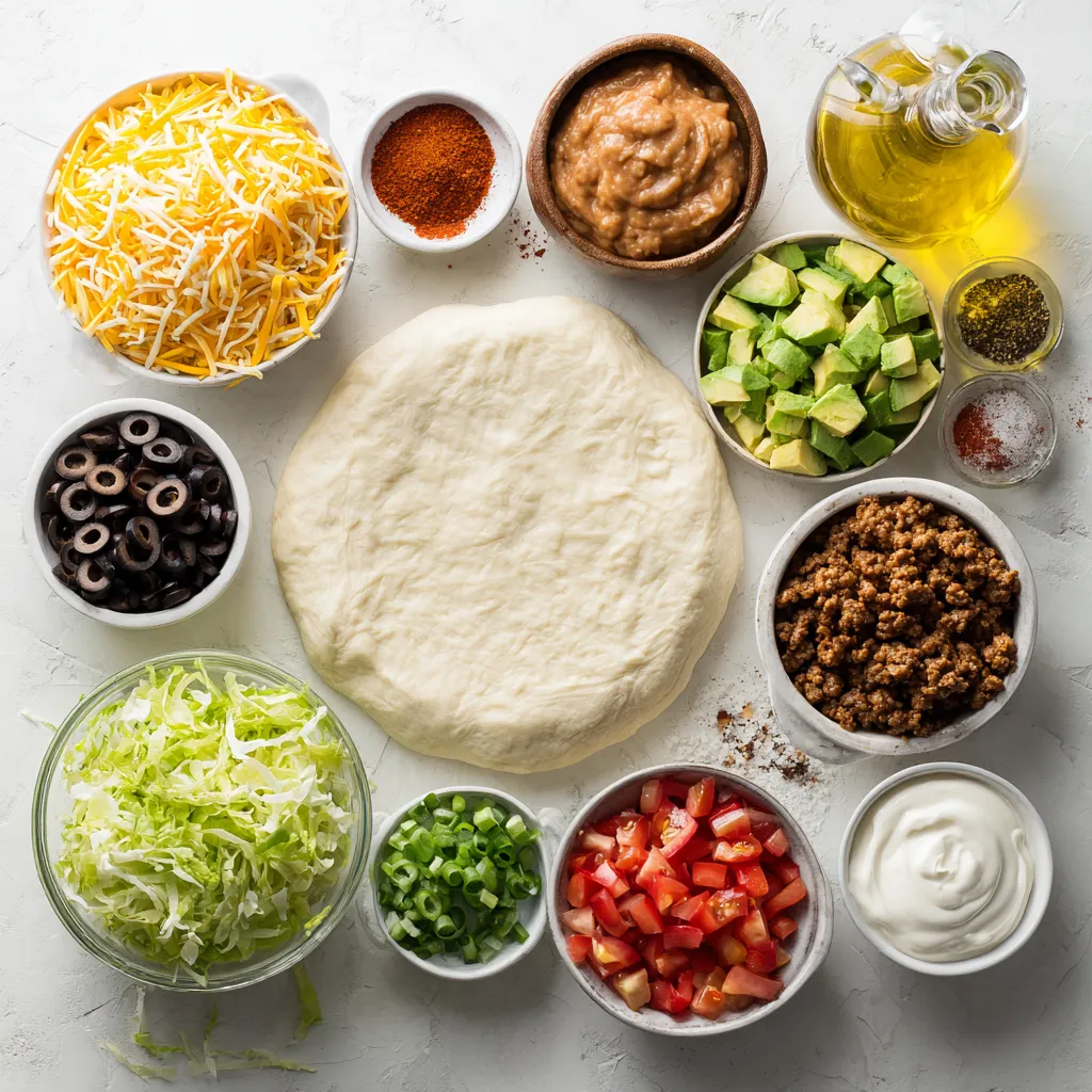 To make this delicious taco pizza, you will need: - 1 large pizza dough (store-bought or homemade) - 1 cup refried beans - 1 ½ cups shredded cheddar cheese - 1 cup cooked ground beef or turkey, seasoned with taco seasoning - 1 cup diced tomatoes - 1 cup shredded lettuce - ½ cup sliced black olives - ¼ cup green onions, sliced - ½ cup sour cream (for drizzle) - 1 avocado, diced - 1 tablespoon olive oil - 1 teaspoon chili powder (optional) - Salt and pepper to taste These ingredients blend perfectly to create a taco twist on pizza that everyone will love. The fun part of making taco pizza is adding your favorite toppings. Here are some ideas: - Fresh cilantro for a burst of flavor - Jalapeños for a spicy kick - Sour cream or guacamole for creaminess - Lime wedges for a zesty touch Feel free to mix and match according to your taste! For the best crust, you can choose either store-bought or homemade dough. Store-bought dough is quick and easy. It saves time, especially on busy nights. If you prefer homemade dough, you can control the ingredients and flavors. Either way, make sure the dough stretches well to fit your sheet pan. A thin, crispy crust makes the best base for your toppings. {{ingredient_image_1}} First, set your oven to 425°F (220°C). This high heat helps the pizza crisp up nicely. While the oven heats, take a large sheet pan and lightly grease it. Use cooking spray or a little olive oil. This step keeps your pizza from sticking. Next, stretch or roll out the pizza dough. Make sure it fits the whole pan. If you use store-bought dough, follow the package directions for stretching. Now, it's time to build your taco pizza. Start by spreading 1 cup of refried beans over the dough. Leave a small border around the edges for the crust. Next, sprinkle half of the shredded cheddar cheese on top of the beans. This layer adds a nice cheesy base. Then, take 1 cup of cooked ground beef or turkey, which should be seasoned with taco seasoning, and spread it evenly over the cheese. This meat layer gives great flavor. After that, top it with the rest of the cheddar cheese and 1 cup of diced tomatoes. For extra taste, drizzle a little olive oil over the top. You can also sprinkle chili powder, salt, and pepper if you want more spice. Once you have everything layered, place the sheet pan in your preheated oven. Bake for 15 to 20 minutes. Keep an eye on it. You want the cheese to be bubbly and golden, while the crust cooks through. After baking, carefully take the pizza out of the oven. Let it cool for a few minutes. Then, slice it into 8 pieces. Load up each slice with fresh toppings. Add shredded lettuce, diced avocado, sliced black olives, and green onions. Finally, drizzle sour cream over the top for a creamy finish. Enjoy this fun twist on pizza! To stretch the pizza dough, start with a clean surface. Use a little flour to keep it from sticking. If you use store-bought dough, let it sit at room temperature for 20 minutes. This helps it stretch easier. Use your hands to gently press the dough outwards. Move from the center to the edges. You can also use a rolling pin if you like. Aim for a thin crust but keep the edges thicker for a nice crust. Taco seasoning makes a big difference in flavor. You can buy it or make your own. If you make your own, mix chili powder, cumin, garlic powder, and onion powder. Use about 2 tablespoons for one pound of meat. This gives the ground beef or turkey a great taste. Don't forget to season the meat well while cooking. Taste as you go; adjust with salt and pepper to suit your taste. For the best cheese melt, use fresh shredded cheese instead of pre-shredded. Pre-shredded cheese has additives that prevent melting well. Mix cheddar with a bit of mozzarella for a great blend. Bake the pizza until the cheese is bubbly and golden, which usually takes 15-20 minutes. Keep an eye on the crust. It should be golden brown and firm to the touch. If the edges brown too fast, you can cover them with foil. This keeps the crust nice and crispy. Pro Tips Use a Hot Oven: Preheating your oven to the correct temperature ensures a crisp crust and perfectly melted cheese. Layer Ingredients Wisely: Start with refried beans as the base to keep the crust from becoming soggy, and layer cheese on top to seal in moisture. Customize Your Toppings: Feel free to add your favorite taco toppings, such as jalapeños, corn, or different types of cheese for added flavor. Let It Rest: Allow the pizza to cool for a few minutes before slicing to help the toppings set and prevent a messy cut. {{image_2}} You can make a tasty vegetarian version of taco pizza. Start with the same dough. Instead of meat, use extra refried beans or black beans. Add more veggies like bell peppers, corn, or zucchini. Sprinkle with cheese and bake as usual. This option packs great flavor and is filling too! If you want to switch the protein, try chicken or turkey. You can also use plant-based meat like lentils or chickpeas. Season them with taco spices for that bold taste. Cooked shrimp or fish can also make a unique twist. Each choice brings its own fun flavor to the pizza. Get creative with your toppings! Try jalapeños for heat or pineapple for sweetness. Fresh cilantro adds a nice touch. You can also add salsa or guacamole after baking. Experimenting with toppings lets you make this dish your own. Each bite can be a new surprise! To store leftover taco pizza, let it cool to room temperature. Then, cut it into slices. Place the slices in an airtight container or wrap them in plastic wrap. You can keep them in the fridge for up to three days. If you want to keep them longer, consider freezing them. When you're ready to enjoy leftovers, preheat your oven to 350°F (175°C). Place the pizza slices on a baking sheet. Heat for about 10 to 15 minutes. This method keeps the crust crispy and the cheese melty. You can also use a microwave, but this may make the crust soft. To avoid sogginess, reheat in the oven whenever you 