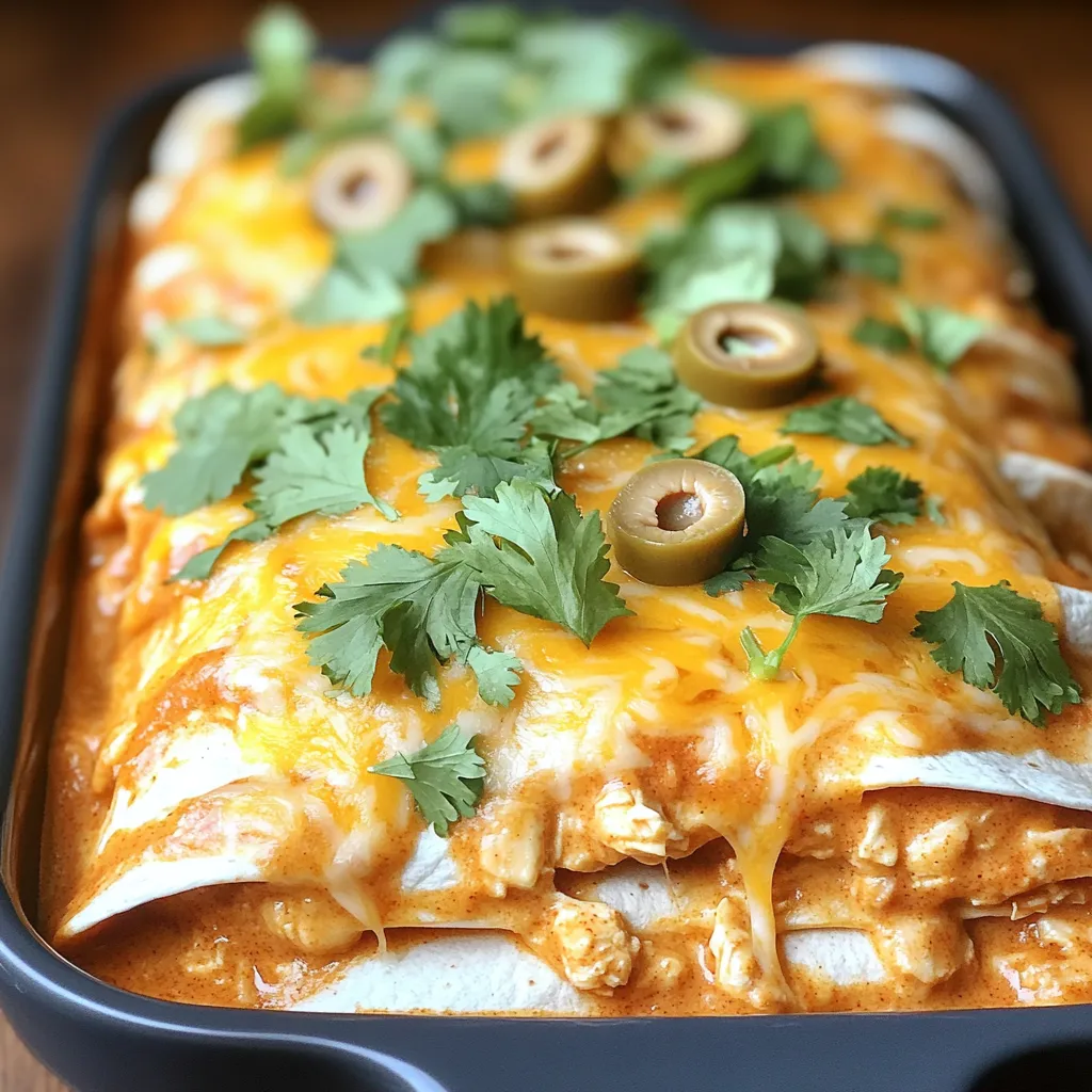 - 2 cups cooked chicken, shredded - 1 can (10 oz) cream of chicken soup - 1 cup sour cream - 1 cup shredded cheese (cheddar or Monterey Jack) - 1 can (4 oz) diced green chiles - 8 corn tortillas - 1 teaspoon garlic powder - 1 teaspoon onion powder - 1 teaspoon cumin - Salt and pepper to taste - Fresh cilantro, for garnish - Sliced olives, for garnish (optional) - Cooked chicken: Use shredded chicken for a tender and easy texture. - Cream of chicken soup: This adds creaminess and rich flavor to the dish. - Sour cream: It brings a nice tang and helps make the sauce creamy. - Shredded cheese: Cheddar or Monterey Jack melts well and adds flavor. - Diced green chiles: They give a mild heat and extra flavor. - Corn tortillas: They serve as the base and provide a great texture. - Garlic powder: This adds a savory depth to the dish. - Onion powder: It enhances the overall flavor without being too strong. - Cumin: This spice gives a warm, earthy note. - Salt and pepper: These basic seasonings balance the flavors. - Fresh cilantro: It adds freshness and a pop of color. - Sliced olives: Optional, but they add a nice briny flavor. - Cooked chicken: You can use rotisserie chicken for convenience. - Cream of chicken soup: Try cream of mushroom soup for a different taste. - Sour cream: Plain Greek yogurt works well for a lighter option. - Shredded cheese: Use pepper jack cheese for a spicy kick. - Corn tortillas: Flour tortillas can also be used if preferred. - Diced green chiles: Fresh diced jalapeños add more heat. - Cumin: Chili powder can replace cumin for a different flavor profile. To start, gather your ingredients. In a large mixing bowl, combine these items: - 2 cups cooked chicken, shredded - 1 can (10 oz) cream of chicken soup - 1 cup sour cream - 1 can (4 oz) diced green chiles - 1 teaspoon garlic powder - 1 teaspoon onion powder - 1 teaspoon cumin - Salt and pepper to taste - Half of your shredded cheese Mix these well until the chicken and sauces blend smoothly. This creamy chicken mixture gives the enchiladas their rich flavor. Next, prepare your slow cooker. Spray the inside with non-stick cooking spray. This step helps prevent sticking. Now, take two corn tortillas. Place them at the bottom of your slow cooker, overlapping if needed. Spread half of the creamy chicken mixture evenly over the tortillas. Add two more tortillas on top. Then, layer the remaining creamy chicken mixture over these. Finally, place the last two tortillas on top. Sprinkle the rest of the shredded cheese over everything. Cover your slow cooker with its lid. Cook the enchiladas on low for 3 to 4 hours. If you are in a hurry, you can set it on high for 1.5 to 2 hours. The cheese should melt, and everything will heat through nicely. Once done, lift the lid carefully. Let the dish sit for a few minutes before you serve. This waiting time helps the flavors settle. Enjoy your creamy chicken enchiladas! Using a slow cooker is easy and fun. Here are some tips to get the best results: - Prep your ingredients: Always have your ingredients ready before you start. - Layer correctly: Place tortillas and mixtures in layers. This helps with even cooking. - Avoid overfilling: Don’t fill the cooker to the top. Leave some space for steam. - Keep the lid closed: Every time you open the lid, heat escapes. Keep it closed for best results. Creamy chicken enchiladas need a rich texture. Here’s how you can make them even creamier: - Use full-fat sour cream: Full-fat adds more creaminess than reduced-fat options. - Mix well: Blend the chicken mixture until it is smooth before layering. - Add more cheese: Extra cheese on top can make it richer and creamier. - Cook on low: Cooking on low for longer allows flavors to meld and textures to soften. Avoid these common errors to ensure your enchiladas turn out great: - Not shredding chicken well: Large pieces can make it hard to layer. - Skipping the cooking spray: This can lead to sticking. Always spray the slow cooker. - Ignoring cooking times: Check the doneness to avoid undercooking or overcooking. - Not letting it sit: Allowing it to rest after cooking helps the flavors settle. {{image_2}} You can easily make these enchiladas vegetarian. Swap the chicken for black beans or lentils. Use a mix of diced bell peppers and corn for added flavor. Replace the cream of chicken soup with cream of mushroom soup. This keeps the dish creamy and rich. You can also add sautéed zucchini or spinach for a fresh touch. If you love heat, add jalapeños to the creamy mixture. Dice fresh jalapeños or use pickled ones for a tangy kick. Mix in one or two tablespoons, depending on your spice level. For an extra layer of flavor, sprinkle some cayenne pepper on top. This variation makes every bite exciting and bold. Consider adding more herbs and spices to boost flavor. Try fresh lime juice to brighten up the dish. You can also sprinkle smoked paprika for a smoky taste. Mixing in some taco seasoning will give a nice twist too. For a cheesy touch, add more cheese between layers or on top before serving. Each adjustment can make your enchiladas unique and delicious. To keep your creamy chicken enchiladas fresh, let them cool first. Then, place leftovers in an airtight container. This helps keep the flavors locked in. You can store them in the fridge for up to three days. Always label your containers with the date, so you don't forget. When you want to enjoy your leftovers, reheat them in the microwave or oven. For the microwave, place a portion on a microwave-safe plate. Cover it with a damp paper towel to prevent drying out. Heat it for 1-2 minutes or until warm. If you prefer the oven, set it to 350°F. Place the enchiladas in a baking dish, cover with foil, and heat for about 15-20 minutes. You can freeze these enchiladas too! To do this, let them cool completely. Wrap each enchilada tightly in plastic wrap. Then, place them in a freezer-safe bag or container. Label with the date. They can last in the freezer 