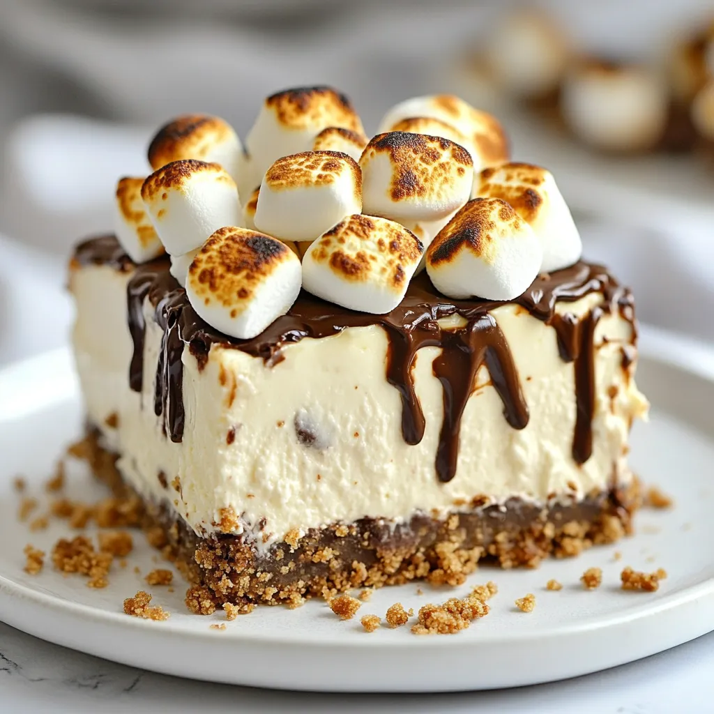 A delicious no-bake cheesecake inspired by the classic s’mores dessert, featuring a graham cracker crust, creamy filling, and topped with mini marshmallows and chocolate chips.