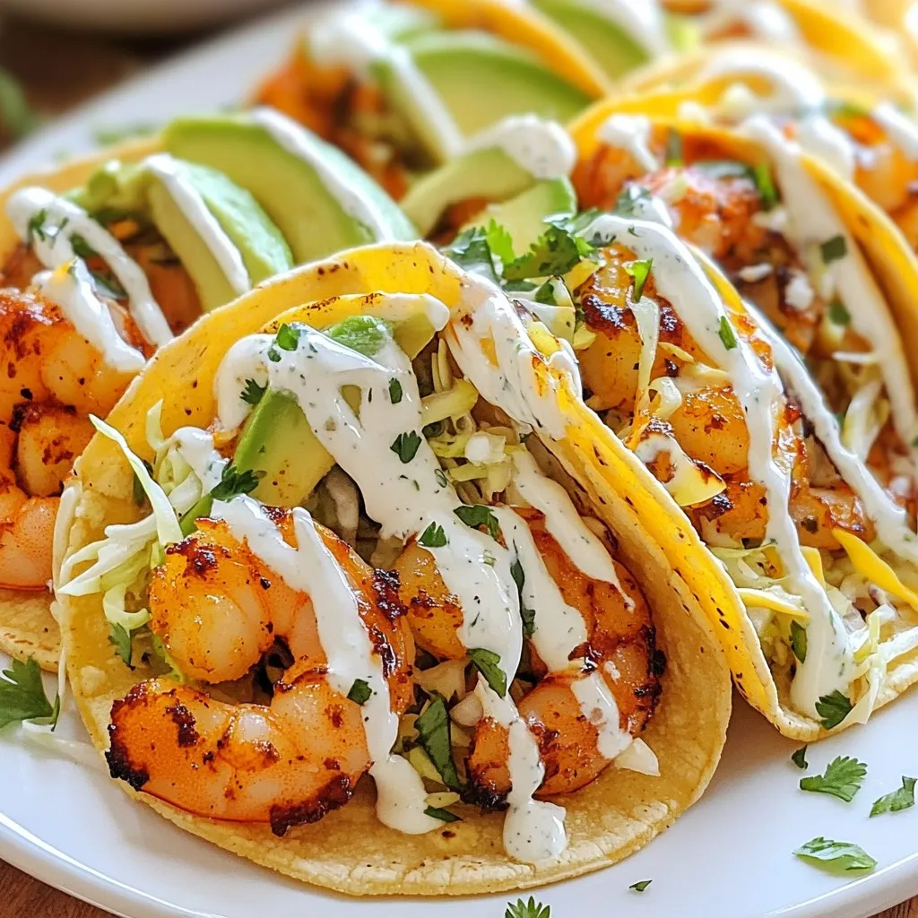Delicious tacos filled with spicy shrimp, topped with creamy lime sauce and fresh ingredients.