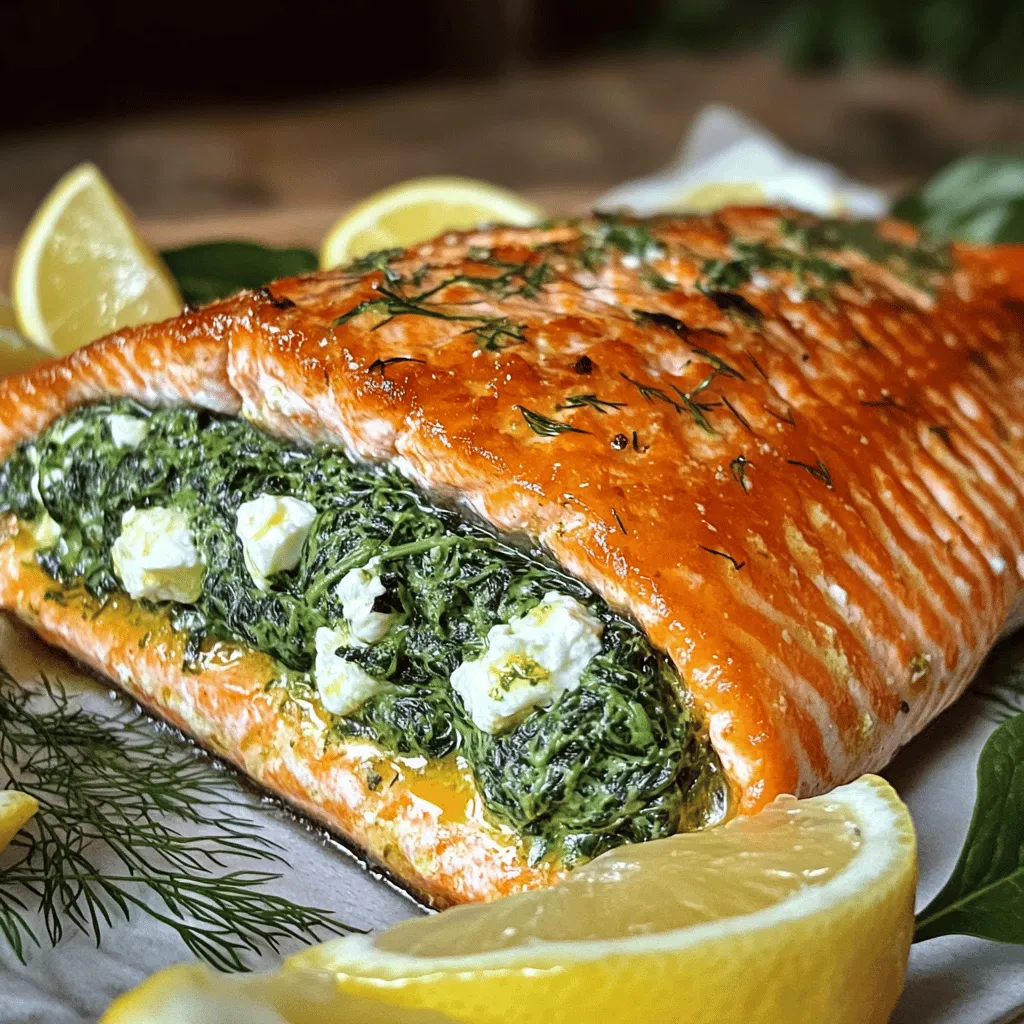 The salmon fillets are the star of this dish. They provide healthy fats and protein. Fresh spinach adds a bright color and nutrients. Feta cheese gives a tangy flavor and creamy texture. Cream cheese helps bind the filling. Garlic adds a warm, savory touch. Lemon juice brightens the dish. Dried dill offers a hint of freshness, while salt and pepper enhance all the flavors.