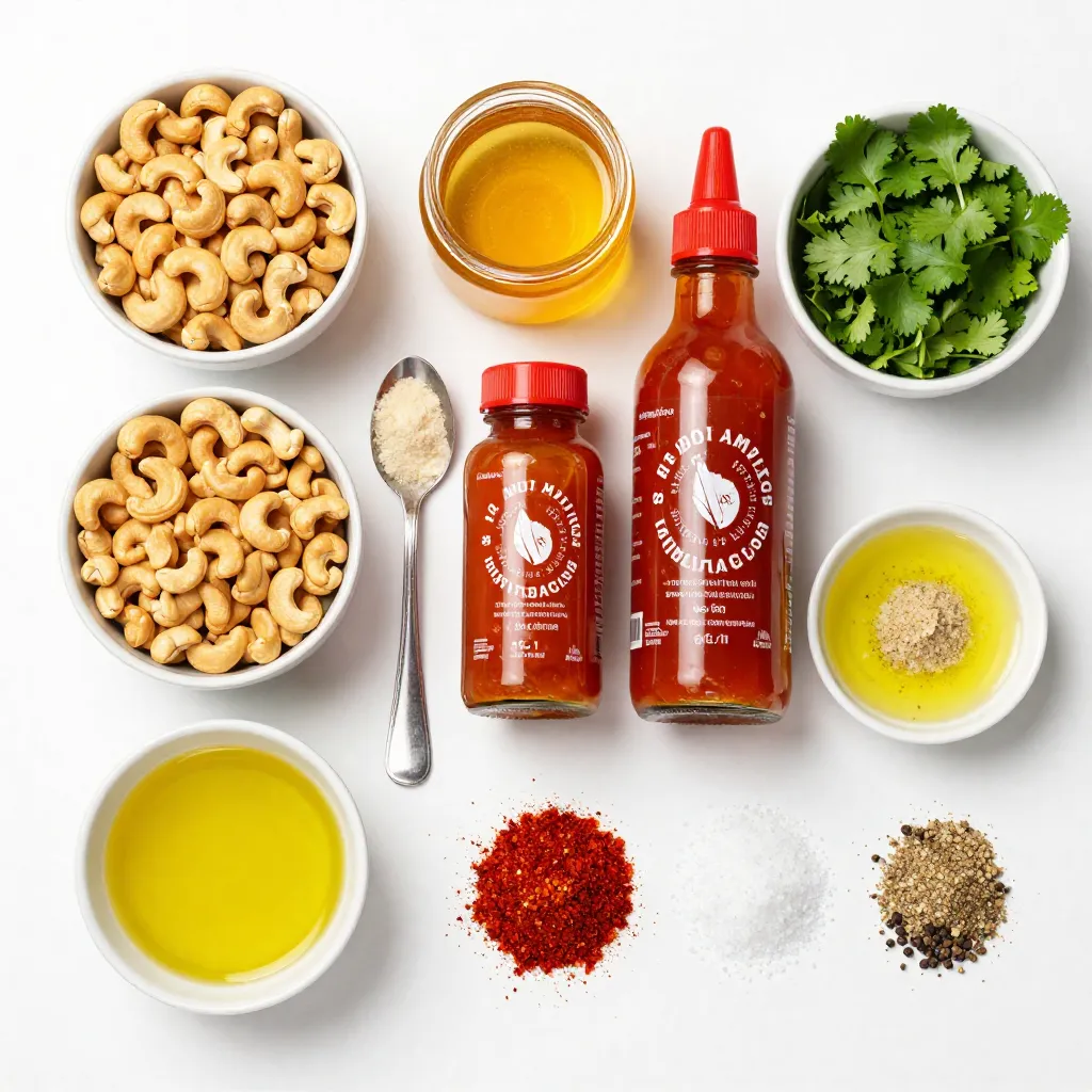Creating Sriracha honey roasted cashews is simple. You need just a few key ingredients to whip up this delicious snack. Here’s what you will need: - 2 cups raw cashews - 2 tablespoons honey - 1 tablespoon Sriracha sauce - 1 tablespoon olive oil - 1 teaspoon garlic powder - 1 teaspoon smoked paprika - 1/2 teaspoon salt - 1/4 teaspoon black pepper - Optional: chopped cilantro for garnish Each ingredient plays a role in the bold flavor explosion of this dish. Raw cashews provide the base with their crunchy texture. Honey adds a sweet touch, balancing the heat from Sriracha. The olive oil helps the glaze stick and enhances the roasting process. Garlic powder and smoked paprika give depth to the taste. Salt and black pepper amplify all the flavors, making each bite delightful. If you want to add a fresh twist, chopped cilantro works great as a garnish. This mix of flavors creates a snack that is both spicy and sweet. {{ingredient_image_1}} First, preheat your oven to 350°F (175°C). This step is key for roasting. Next, line a baking sheet with parchment paper. This helps with easy clean-up later. In a medium bowl, combine 2 tablespoons of honey and 1 tablespoon of Sriracha sauce. This mix gives the cashews their sweet and spicy kick. Now, add 1 tablespoon of olive oil, 1 teaspoon of garlic powder, 1 teaspoon of smoked paprika, 1/2 teaspoon of salt, and 1/4 teaspoon of black pepper. Stir until everything blends well. Add 2 cups of raw cashews to the bowl. Mix them well in the glaze. Make sure each cashew gets a nice, even coat. This ensures every bite is full of flavor. Spread the coated cashews in a single layer on the baking sheet. Bake them for 15 to 20 minutes. Stir halfway through for even roasting. Watch closely in the last few minutes. You don’t want them to burn. Once they are golden brown and smell great, take them out of the oven. Let the cashews cool on the baking sheet. If you want, top them with chopped cilantro for a fresh twist. This adds color and flavor before you enjoy them! To get the best roast on your cashews, keep a close eye on them. The oven can be tricky. Set a timer for 15 minutes, but check them often. Stir the cashews halfway through the baking time. This helps them roast evenly. If you skip stirring, some nuts may burn while others stay raw. Watch them closely in the last few minutes. They can go from perfect to burnt quickly! Want more heat? Add extra Sriracha sauce. If you like it milder, reduce the Sriracha by half. You can also try other hot sauces for a twist. For sweetness, swap honey with maple syrup or agave nectar. Each sweetener will change the flavor a bit. Experiment to find your favorite mix! Store your Sriracha honey roasted cashews at room temperature. Use an airtight container to keep them fresh. They last about a week this way. For an extra flavor boost, try adding spices like cayenne pepper or chili powder. This adds a new layer of heat and taste. If you want to enjoy them later, freezing is an option. Just remember to let them cool completely before storing! Pro Tips Tip 1: Use fresh cashews for the best flavor and crunch. Stale nuts can affect the overall taste of your roasted cashews. Tip 2: Adjust the Sriracha to your spice preference. If you like it spicier, feel free to add more Sriracha, but remember to balance it with honey. Tip 3: Let the cashews cool completely on the baking sheet. This will help them crisp up even more as they cool. Tip 4: Experiment with other spices! Adding a pinch of cayenne or some chili powder can enhance the flavor profile of your roasted cashews. {{image_2}} You can make Sriracha honey roasted cashews even better by adding nuts and seeds. Consider mixing in almonds, pecans, or pumpkin seeds. These add crunch and flavor. You can also try different hot sauces. If you want more heat, use a spicier sauce like chili garlic. For a milder option, try a sweet chili sauce. Each sauce changes the taste, making it fun to experiment. If you're looking for gluten-free options, you’re in luck! All the ingredients are naturally gluten-free. Just check labels to be sure. For vegan alternatives, swap honey for maple syrup or agave nectar. This keeps the sweet flavor while making it plant-based. These small changes keep the dish tasty for everyone. When serving, put your cashews in a bowl or on a platter. Garnish with chopped cilantro for color and extra flavor. You could also add lime wedges for a zesty touch. Pair these cashews with beverages like iced tea or craft beer. They make a great snack for parties or game days. To keep your Sriracha honey roasted cashews fresh, store them in an airtight container. This helps lock in flavors and crunch. You can keep them at room temperature for up to one week. Make sure to place the container in a cool, dark spot, away from heat and sunlight. If you want to enjoy these cashews longer, consider freezing them. Place the cooled cashews in a freezer-safe bag or container. They can last for about three months in the freezer. When you’re ready to eat them, just take out the desired amount and let them thaw at room temperature. To keep that perfect crunch after freezing, avoid reheating them in the microwave. Instead, spread the cashews on a baking sheet and pop them in a preheated oven at 350°F (175°C) for about 5-10 minutes. This brings back their crispy texture, making every bite delicious! Sriracha honey roasted cashews are a tasty snack. They combine sweet honey and spicy Sriracha sauce. This mix gives cashews a bold flavor. The garlic powder and smoked paprika add depth. When baked, they become crunchy and fragrant. This dish is perfect for parties or movie nights. Yes, you can make these cashews ahead of time. They store well in an airtight container. Let them cool completely before storing. This keeps them crunchy and tasty. You can make a big batch for events or snacks. Just remember to watch the baking time closely. You can find pre-made Sriracha honey roasted cashews at ma