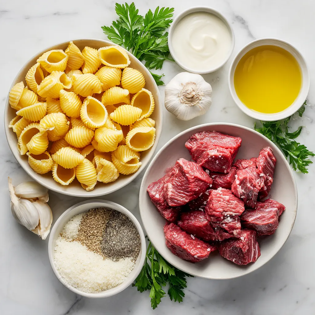 To make Steak Bites Shell Pasta Alfredo, gather these simple ingredients: