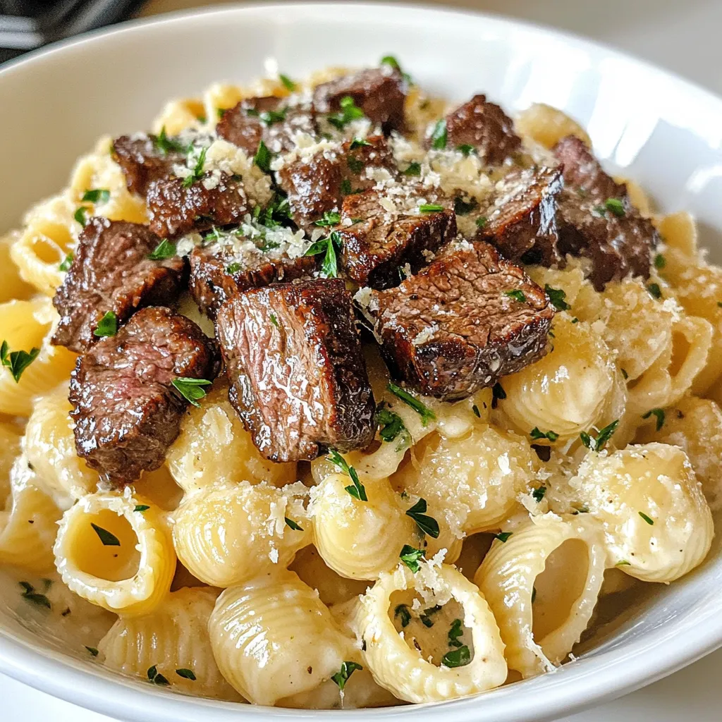 A creamy and savory dish featuring tender steak bites and large shell pasta in a rich Alfredo sauce.