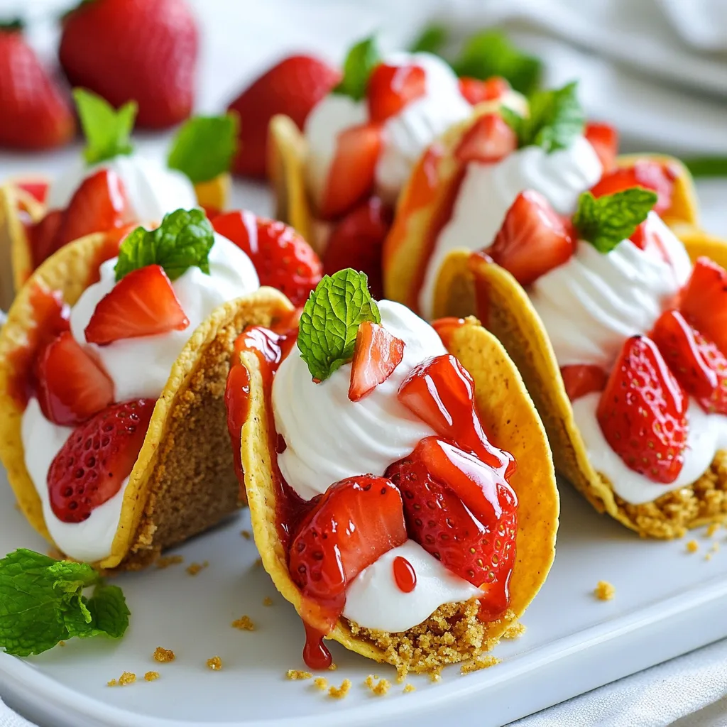 For a stunning display, use a vibrant platter. Arrange the tacos neatly, with some space in between. Drizzle extra strawberry sauce on the platter edges. Sprinkle crumbled graham crackers on top. Add fresh mint leaves for color. Serve chilled for the best experience.