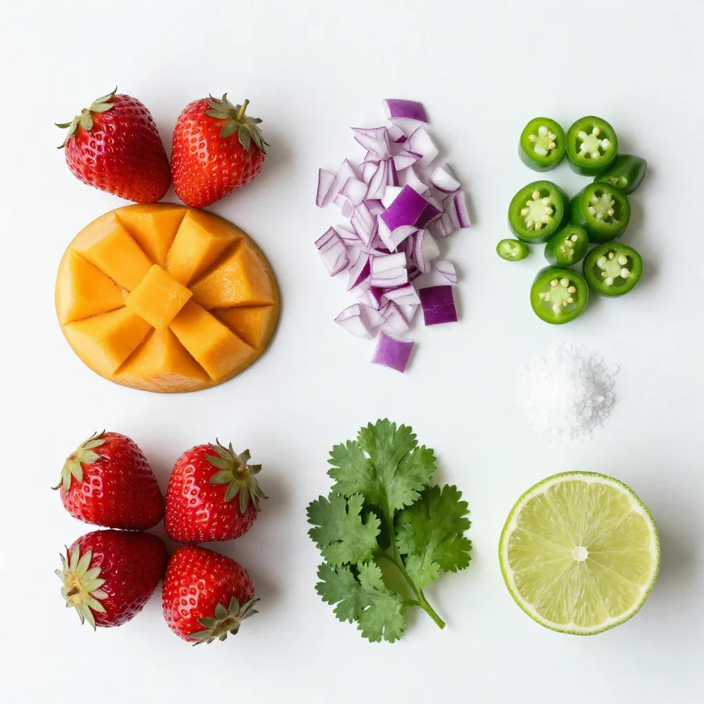 - 1 cup strawberries, hulled and diced - 1 cup mango, peeled and diced - 1/2 red onion, finely chopped - 1 jalapeño, deseeded and finely minced - 1/4 cup fresh cilantro, chopped - Juice of 1 lime - Salt to taste Strawberries bring sweetness and color to this salsa. They should be fresh and ripe. Mangoes add a tropical twist. Choose a ripe mango that gives slightly when you press it. Red onion gives a nice crunch and sharpness. Jalapeño adds heat, but you can adjust it to your taste. Fresh cilantro adds a burst of flavor. Lime juice brightens the whole dish. Salt enhances all the flavors. - If you can't find strawberries, try peaches or nectarines. - For mango, papaya or kiwi can work well too. - You can swap lime juice with lemon juice for a different taste. - If you don’t like cilantro, parsley or mint can be good options. These substitutes will keep the salsa fresh and tasty. Mixing different fruits can create new flavors. Feel free to experiment and make it your own! {{ingredient_image_1}} 1. In a medium mixing bowl, combine 1 cup of hulled and diced strawberries and 1 cup of peeled and diced mango. This mix creates a bright and sweet base. 2. Next, add 1/2 a finely chopped red onion. The onion brings a nice crunch and a hint of sharpness. 3. Then, add 1 minced jalapeño, making sure to deseed it first. Adjust the amount based on your spice preference. Finally, gently fold in 1/4 cup of chopped fresh cilantro. This herb adds freshness and depth to the salsa. 4. Squeeze the juice of 1 lime over your mixture. This adds brightness and balances the sweetness of the fruits. Sprinkle in salt to taste. Salt enhances all the flavors. 5. Now, mix everything together gently. You want to keep the fruits intact while ensuring they combine well. 6. Let the salsa rest for about 10 minutes. This short pause allows the flavors to meld beautifully. The wait is worth it! - Ideal serving bowls and garnishes: Use a bright bowl that highlights the colors. A clear glass bowl shows off the salsa well. Garnish with extra cilantro and a lime wedge for a fresh look. - Pairings with main dishes: This salsa pairs great with grilled chicken or fish. The sweet and spicy flavors complement savory dishes nicely. You can also serve it with tacos for a fun twist. - Best ways to enjoy with tortilla chips: For the best crunch, use thick tortilla chips. Scoop a generous amount of salsa on each chip. Enjoy every bite with the fresh flavors of fruit. - How to select ripe fruit: Choose strawberries that are bright red and firm. The mango should feel slightly soft but not mushy. Check for a sweet smell at the stem; that means it's ripe. - Adjusting spice levels: If you like more heat, add more jalapeño. For a milder taste, remove all the seeds from the jalapeño. Mix and taste until it fits your spice level. - Maximizing flavor freshness: Always use fresh ingredients for the best taste. Prepare the salsa just before serving to keep the flavors bright. Let it rest for 10 minutes to deepen the flavor before enjoying. Pro Tips Choose Ripe Fruits: Ensure your strawberries and mangoes are perfectly ripe for the best flavor and sweetness in your salsa. Adjust Spice Level: If you prefer a milder salsa, you can omit the jalapeño or use a smaller amount to suit your taste. Let It Rest: Allowing the salsa to sit for about 10 minutes helps the flavors meld together beautifully, enhancing the overall taste. Serve Cold: For the freshest taste, serve the salsa chilled. This makes it a refreshing option for hot days or gatherings. {{image_2}} You can easily change up this salsa to fit your taste. Here are some fun ideas: - Tropical fruits addition: Try adding diced pineapple or kiwi. These fruits bring more sweetness and a fun twist. - Adding spices for heat: If you like spice, add chipotle or cayenne pepper. Start small; you can always add more. - Creative flavor enhancements: A drizzle of honey adds sweetness. Fresh ginger gives a zesty kick. These flavors make it unique and exciting. Adapting this salsa for different diets is simple. Here are some options: - Vegan-friendly adjustments: This recipe is already vegan. You can enjoy it without worry! - Gluten-free serving options: Serve with gluten-free chips or fresh veggies. You can pair it with grilled meat or fish. - Low-sodium alternatives: Use less salt or try adding lime juice for flavor. This keeps it tasty without excess sodium. Store your salsa in an airtight container. Glass or plastic containers work well. Make sure the lid seals tightly. This helps keep the salsa fresh and flavorful. Put the container in the fridge right after making it. Cold temperatures slow down spoilage. Avoid leaving the salsa out for too long. Keeping it chilled protects the taste and texture. You can enjoy your salsa for about 3 days in the fridge. After that, it may lose its bright flavors. Look out for signs of spoilage. If the colors fade or the salsa smells off, it’s time to toss it. Mold is another clear sign that it’s no longer safe to eat. Can I make this salsa ahead of time? Yes, you can make this salsa ahead of time. I suggest making it a few hours before serving. It needs time to blend the flavors. However, I recommend not making it too far in advance. Fresh fruit can lose its crunch and color. What fruits work best in this recipe? Strawberries and mango are the stars of this recipe. They bring sweetness and juiciness. You can also try other fruits like peaches or kiwi. Just ensure the fruits are ripe for the best taste. How spicy is this salsa and how can I adjust it? The heat level depends on the jalapeño used. With one jalapeño, it has a mild spice. If you like more heat, add another jalapeño or leave some seeds in. For less spice, use half a jalapeño or skip it altogether. Caloric content and serving size One serving of this salsa has about 50 calories. This recipe serves four, so total calories are around 200. This makes it a light and tasty dip. Health benefits of the ingred
