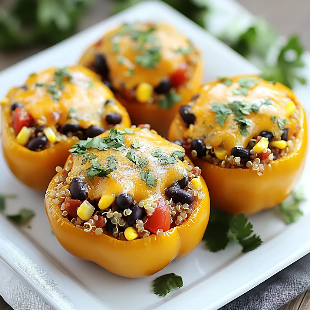 A vibrant and flavorful dish featuring bell peppers stuffed with a hearty quinoa mixture, perfect for a festive meal.