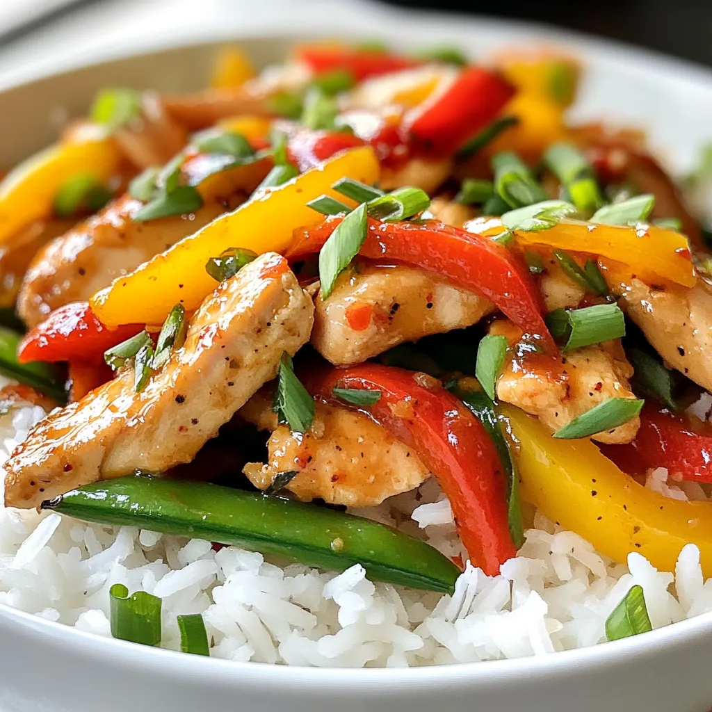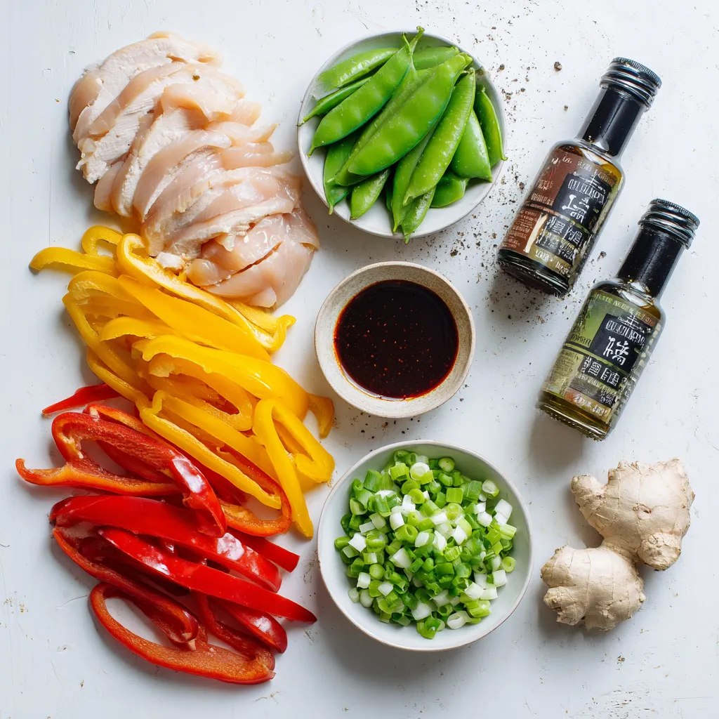 I love using fresh ingredients for this dish. The chicken gives a great base. The red and yellow bell peppers add color and crunch. Sugar snap peas bring a sweet snap, making each bite fun. Garlic and ginger add amazing depth. Green onions finish the dish with a fresh touch.