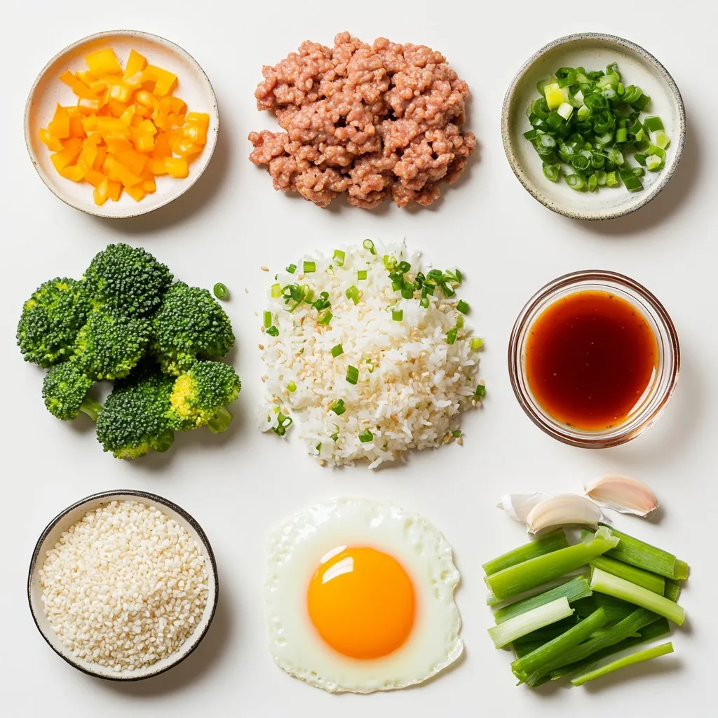 Next, I prepare my base: cooked rice. It absorbs the sauce and balances the meal. I use broccoli florets and sliced bell pepper for color and nutrition. A little vegetable oil helps cook the veggies perfectly. Finally, sesame seeds make a great garnish.